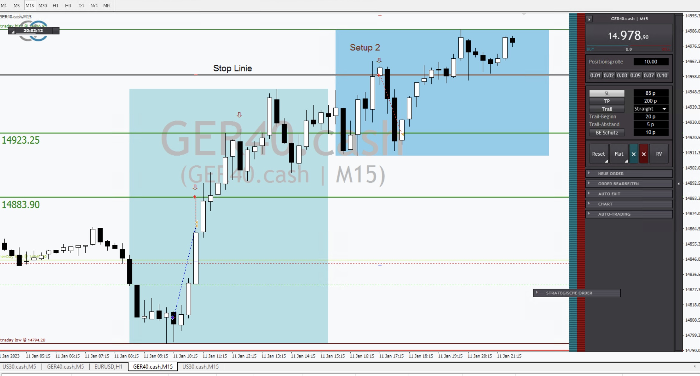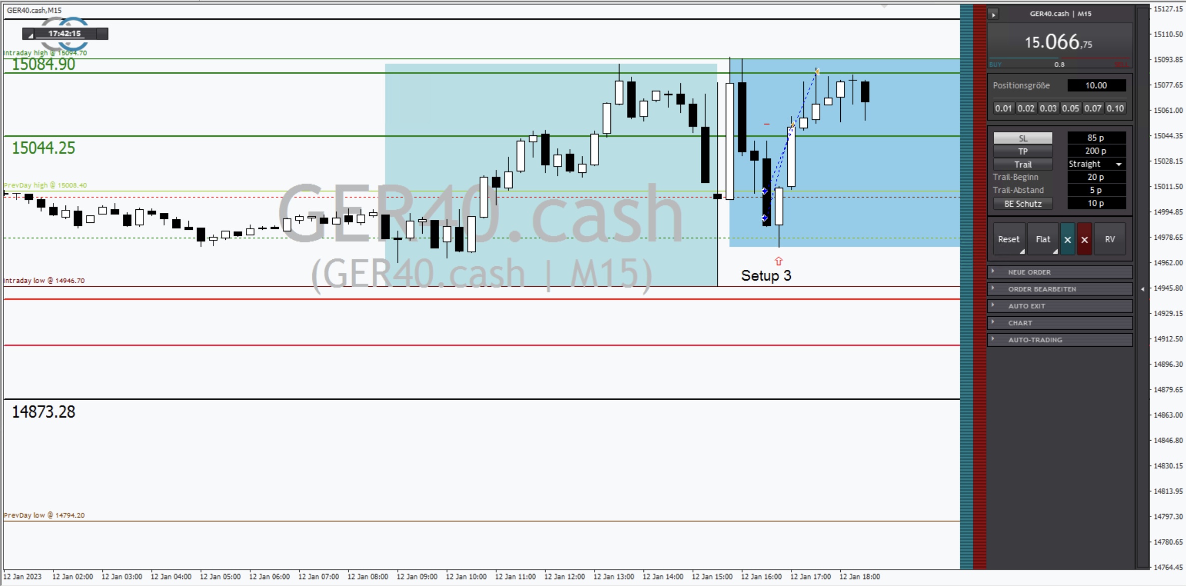 3. am Nachmittag dann dein Setup 2 (Durchandeln des morgendlichen SL) mit Gewinnmitnahme an der Zonenlinie 2