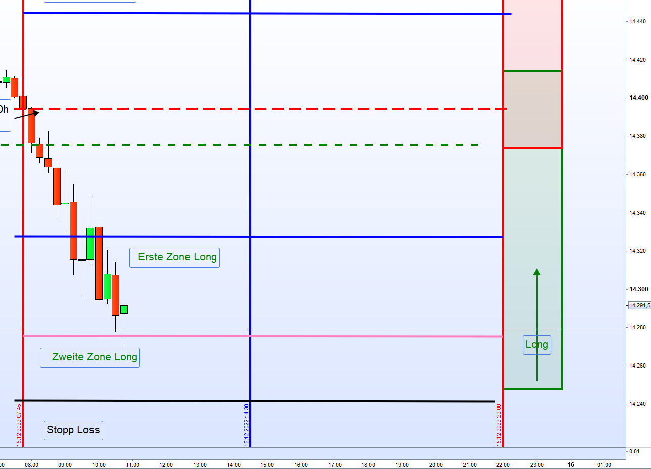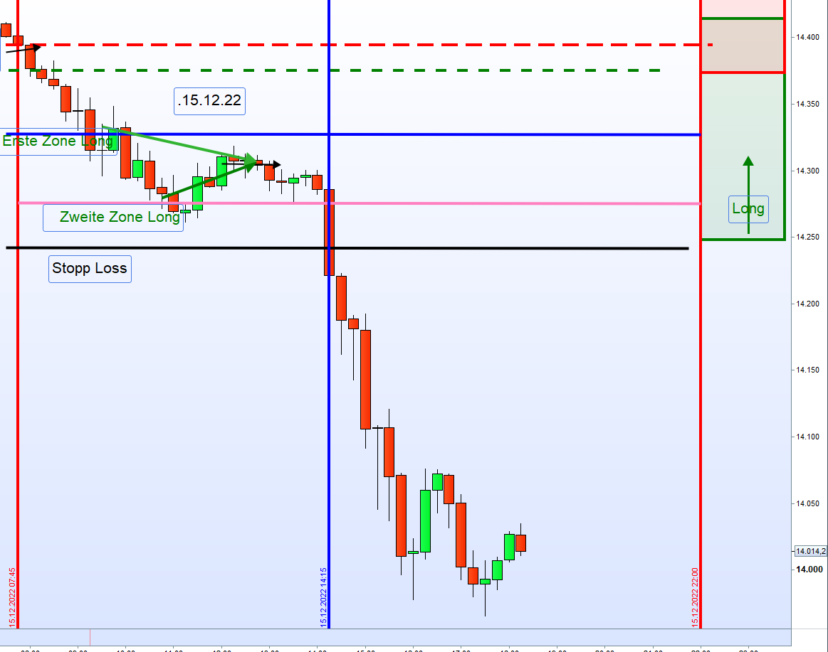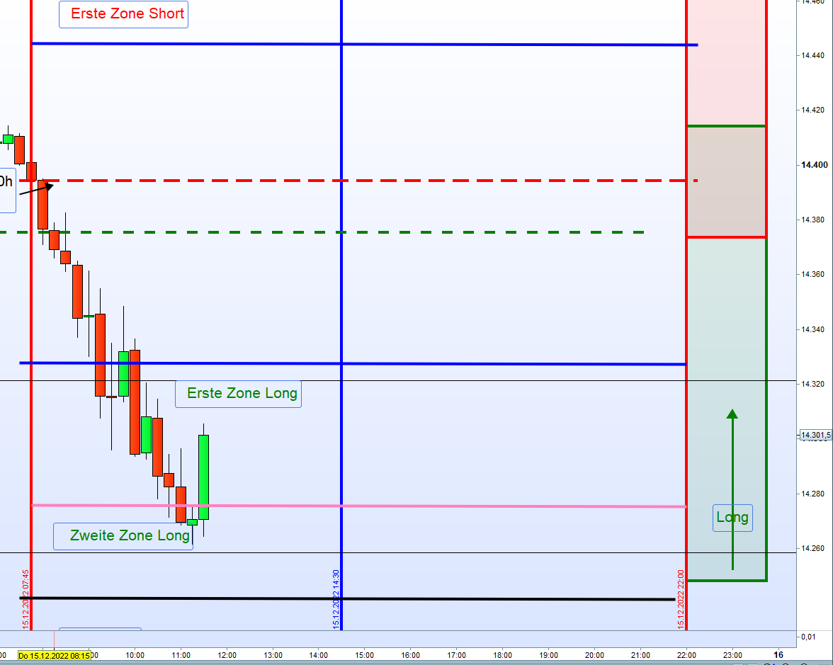wir haben diesmal natürlich eine Ausnahmesituation. Gestern der Zinsentscheid der FED heute der Zinsentscheid der EZB und morgen großer Verfall und und das auch noch zum Jahresende. Abgesehen davon, tendiert auch heute schon den ganzen Tag der DOW deutlich im Minus. Ergo, ein schwieriger Tag für den Zonenhandel. Auch Georg hatte mal in der Vergangenheit erwähnt, dass an Tagen an denen der Dow Jones in's Minus tendiert an EZB Tagen besser abgewartet werden sollte. Zusätzlich erklärte er auch, dass in Zeiten von Zinserhöhungen nicht einfach dir nichts mir nichts long gegangen werden kann. Außerdem bin ich der Meinung, auch wenn im Regelwerk nicht erfasst, dass der große Verfall, insbesondere zum Jahresende, großen Einfluss auf den Handel hat. Betrachtet man die augenblickliche Situation so liegt das (angenehme) Niveau für die Stillhalter zwischen 14.300 /14.500. Es könnte gegebenenfalls dazu führen, dass die 14.300 heute nochmals übersprungen werden. Richtig spannend, wird es aber dann erst morgen früh bis 13:00 Uhr.