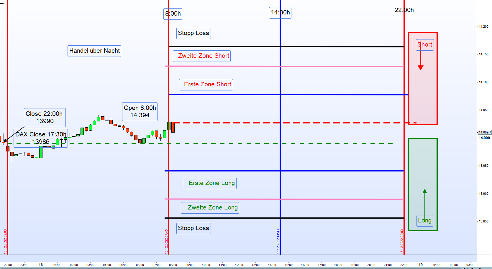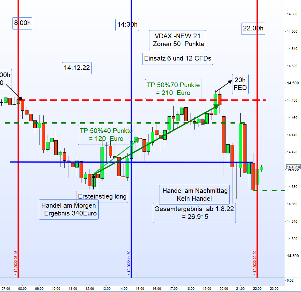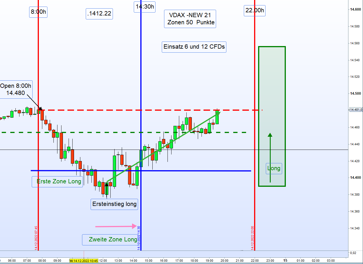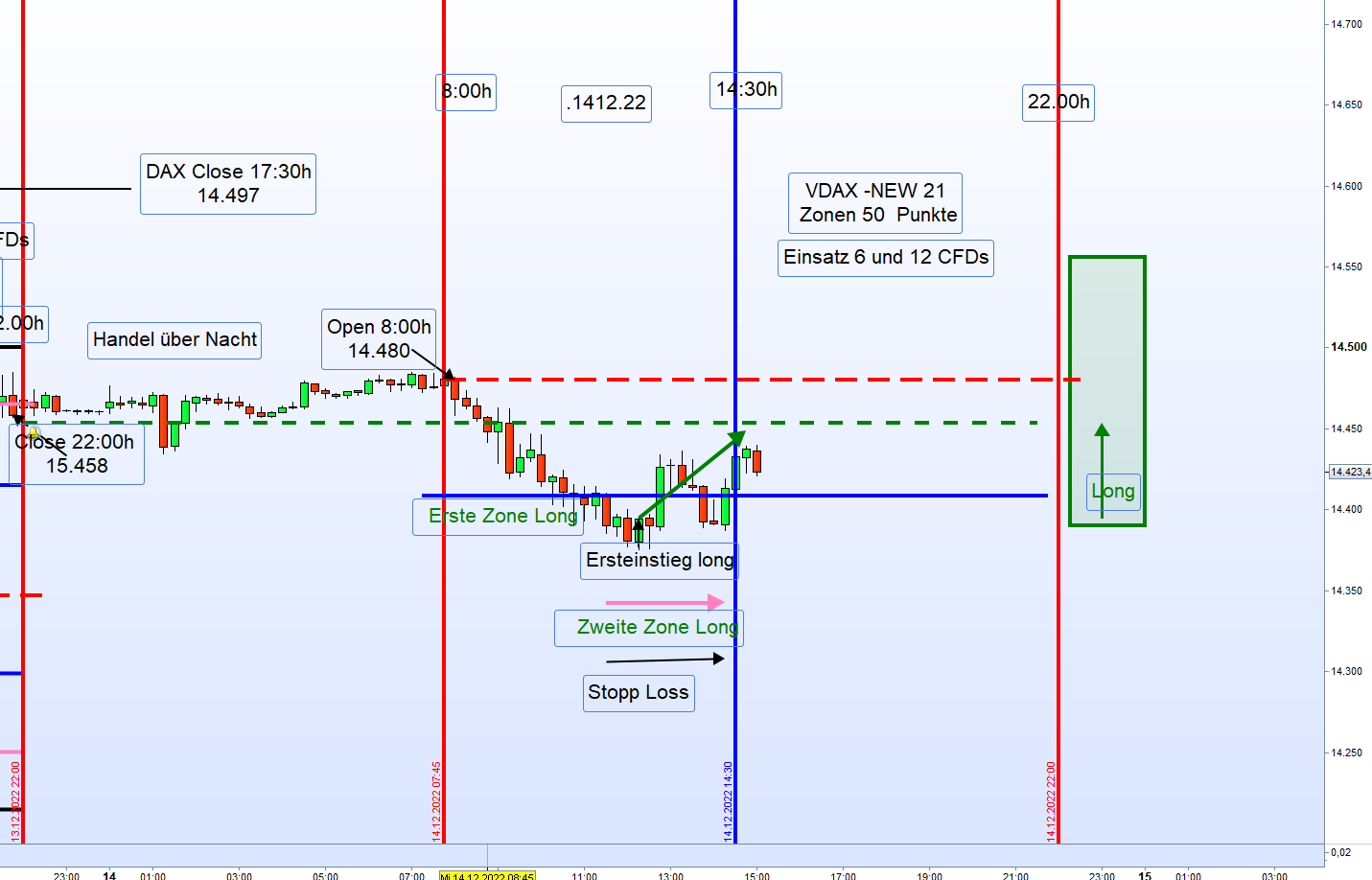 wir haben diesmal natürlich eine Ausnahmesituation. Gestern der Zinsentscheid der FED heute der Zinsentscheid der EZB und morgen großer Verfall und und das auch noch zum Jahresende. Abgesehen davon, tendiert auch heute schon den ganzen Tag der DOW deutlich im Minus. Ergo, ein schwieriger Tag für den Zonenhandel. Auch Georg hatte mal in der Vergangenheit erwähnt, dass an Tagen an denen der Dow Jones in's Minus tendiert an EZB Tagen besser abgewartet werden sollte. Zusätzlich erklärte er auch, dass in Zeiten von Zinserhöhungen nicht einfach dir nichts mir nichts long gegangen werden kann. Außerdem bin ich der Meinung, auch wenn im Regelwerk nicht erfasst, dass der große Verfall, insbesondere zum Jahresende, großen Einfluss auf den Handel hat. Betrachtet man die augenblickliche Situation so liegt das (angenehme) Niveau für die Stillhalter zwischen 14.300 /14.500. Es könnte gegebenenfalls dazu führen, dass die 14.300 heute nochmals übersprungen werden. Richtig spannend, wird es aber dann erst morgen früh bis 13:00 Uhr.