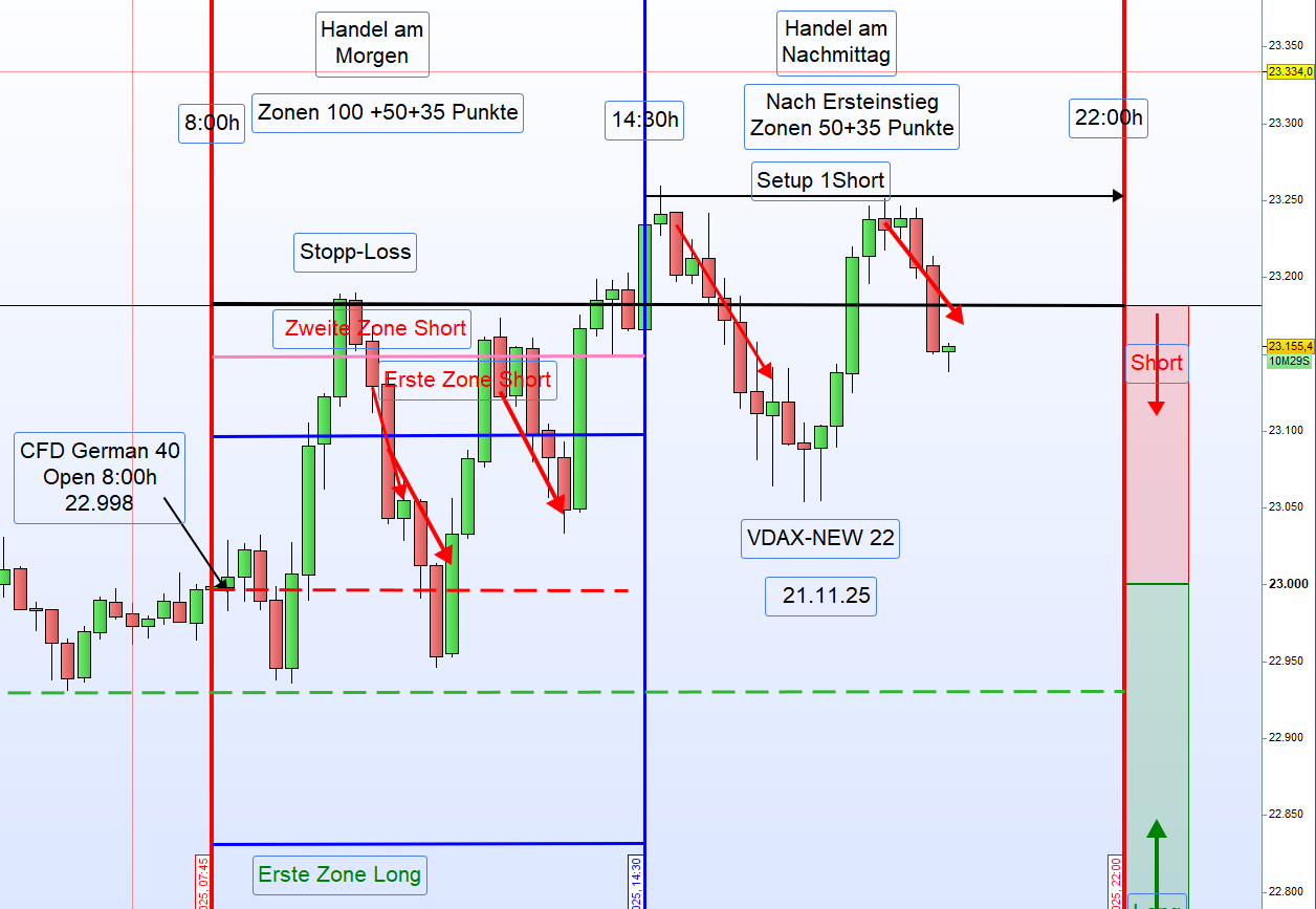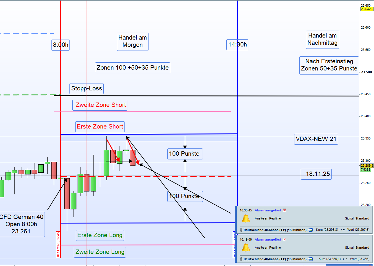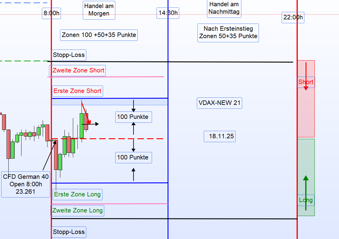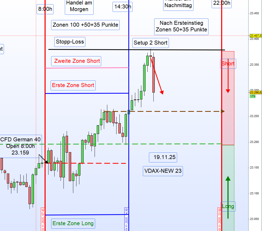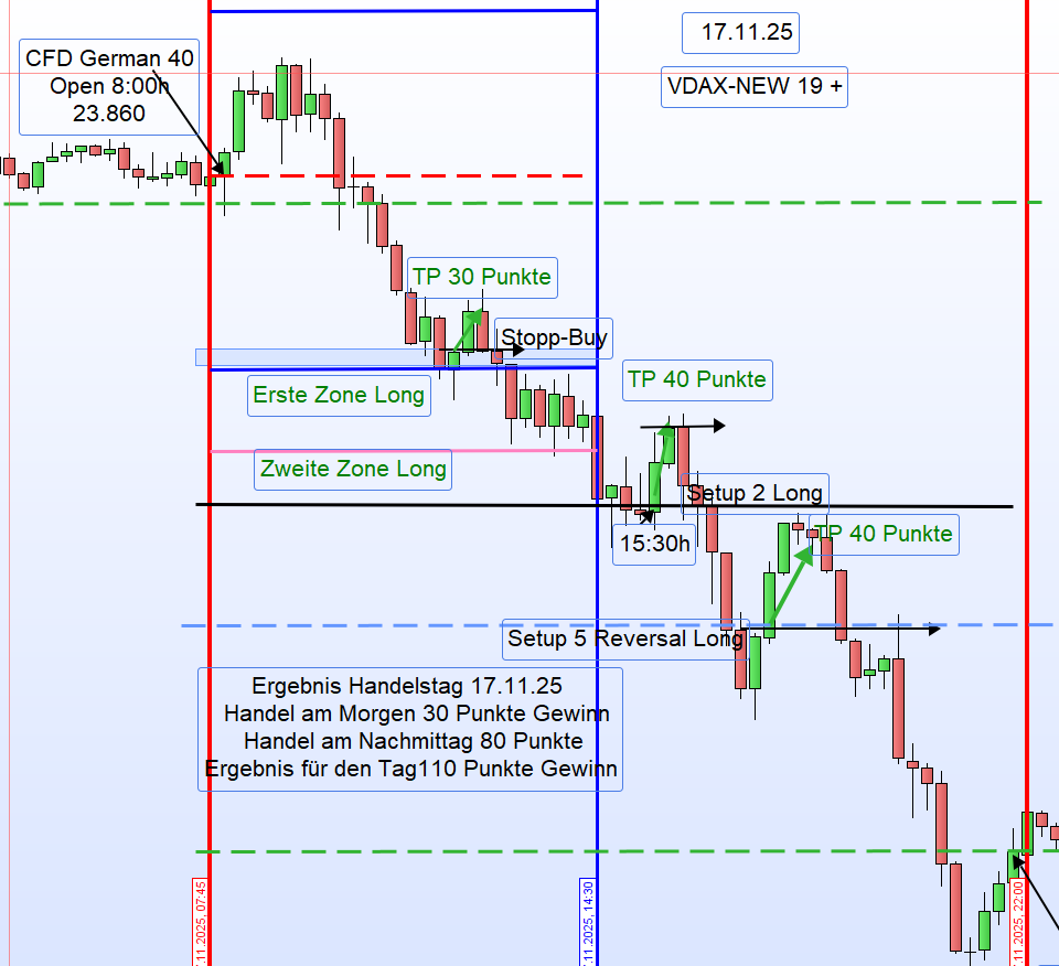 Zusammenfassung – Handel German 40 heuteAm Morgen konnten vier Trades aus der ersten Zone Short ausgeführt werden sowie drei Long-Trades nach Setup 4.Der reguläre Einstieg an der ersten Zone Short liegt 10 Punkte unterhalb der Aktionszone.Da die Aktionszone heute 100 Punkte über dem Eröffnungskurs von 23.261 lag, ergab sich eine Aktionszone bei 23.361.Es kommt häufig vor, dass der Kurs die Aktionszone um 1–3 Punkte verfehlt – sogenannte Near Misses.Als diskretionär erfahrene Trader können die Positionen daher bei 23.251 – also 10 Punkte unterhalb der Aktionszone – Short ausgeführt werden, selbst wenn der Kurs die Aktionszone nicht exakt erreicht.Insgesamt war nach den hektischen Auf-und-Ab-Trendtagen wieder ein geordneter Zonenhandel möglich.