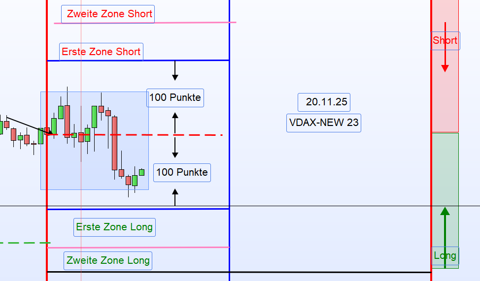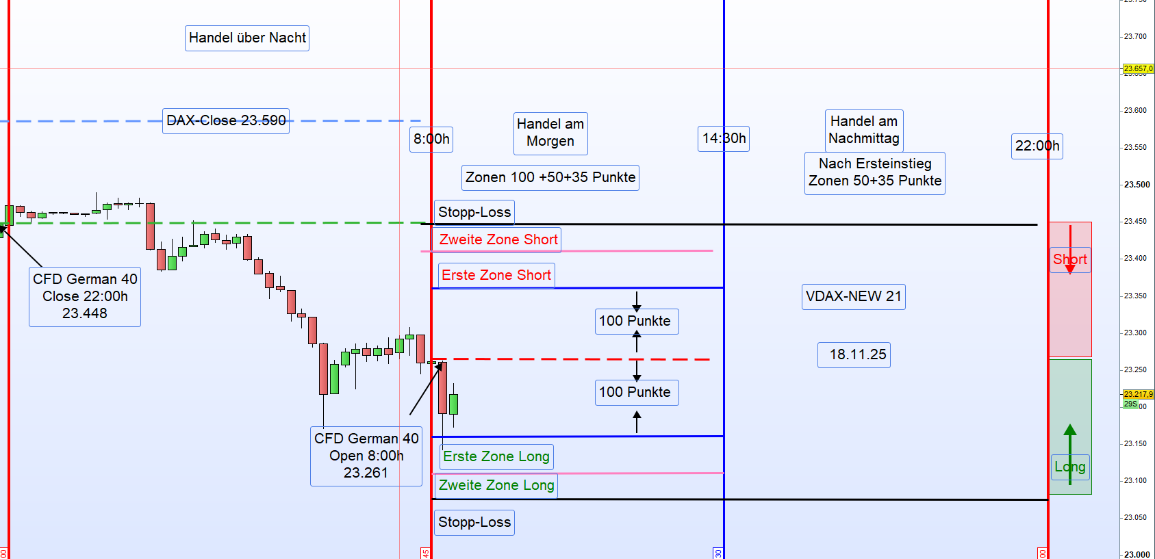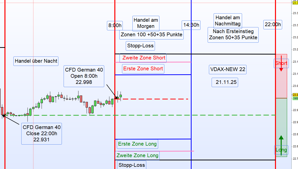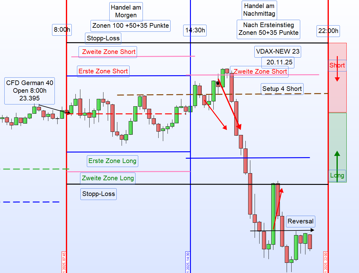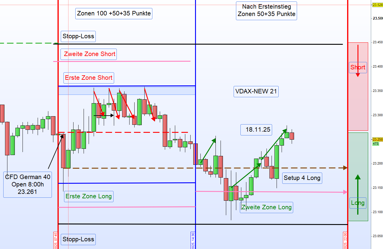 Zusammenfassung – Handel German 40 heuteAm Morgen konnten vier Trades aus der ersten Zone Short ausgeführt werden sowie drei Long-Trades nach Setup 4.Der reguläre Einstieg an der ersten Zone Short liegt 10 Punkte unterhalb der Aktionszone.Da die Aktionszone heute 100 Punkte über dem Eröffnungskurs von 23.261 lag, ergab sich eine Aktionszone bei 23.361.Es kommt häufig vor, dass der Kurs die Aktionszone um 1–3 Punkte verfehlt – sogenannte Near Misses.Als diskretionär erfahrene Trader können die Positionen daher bei 23.251 – also 10 Punkte unterhalb der Aktionszone – Short ausgeführt werden, selbst wenn der Kurs die Aktionszone nicht exakt erreicht.Insgesamt war nach den hektischen Auf-und-Ab-Trendtagen wieder ein geordneter Zonenhandel möglich.