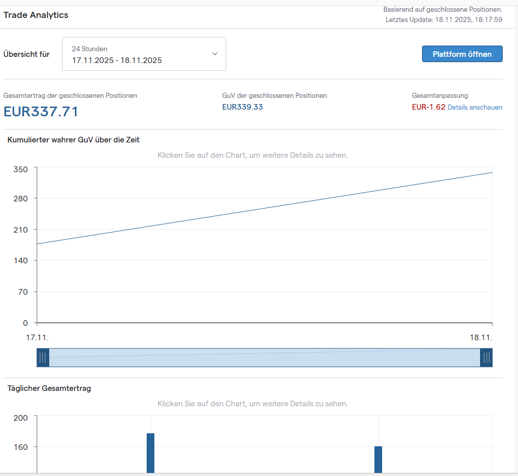 Zusammenfassung Handelstag 21.11.25Nach der breiten Korrektur am Vortag kam es heute – wie typischerweise zu erwarten – zu einer kurzfristigen Erholung. Während dieser Erholungsphase konnten am Morgen erfolgreiche Trades aus der zweiten sowie aus der ersten Zone umgesetzt werden.Am Nachmittag bot das Tageshoch zwei weitere Short-Setups (Setup 1), die ebenfalls gehandelt wurden. Insgesamt ergab sich damit ein positiver Handelstag.