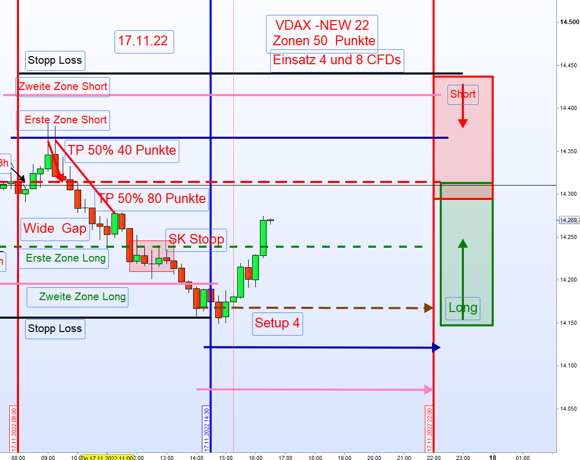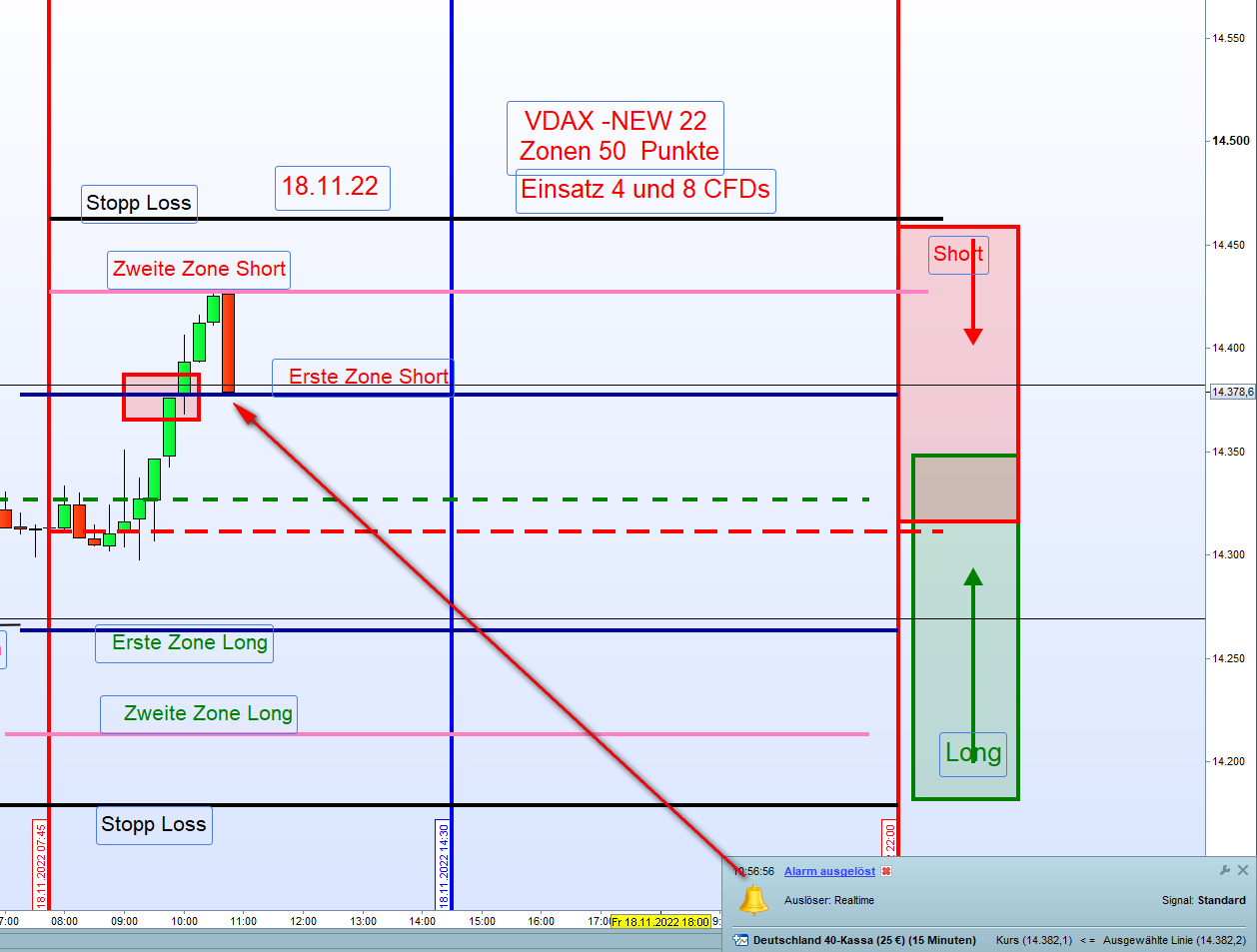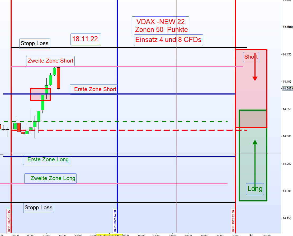wenn der erste Trade erfolgreich und das Ziel gegenüber, hier die Zone 1 erreicht hat und der Kurs steigt wieder von Zone 1 zur Zone 2 hoch, so dass ein komplett, erneuter Einstieg möglich wäre, aber dann greift die folgende Regel, sodass das kein Einstieg wäre, weil VDAX über 20??