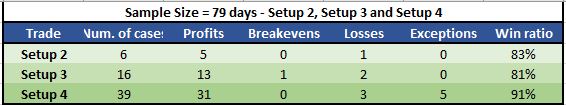 f) Exceptions: Hierbei handelt es sich um die Anzahl der Fälle, in denen der Kurs das Einstiegsniveau erreicht, sei es die GAPs oder L1, L2, S1 oder S2, es aber keine Umkehrkerze gibt oder die entsprechenden in der Strategie definierten Einstiegsbedingungen nicht erfüllt sind, z. B. bei den GAPs, wenn die Volatilität im VDAX-new 30 Punkte überschreitet.