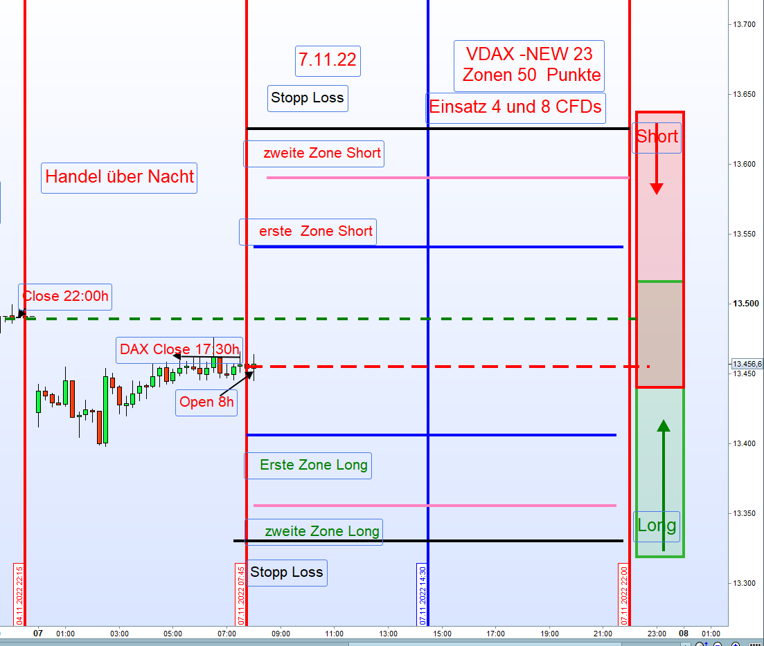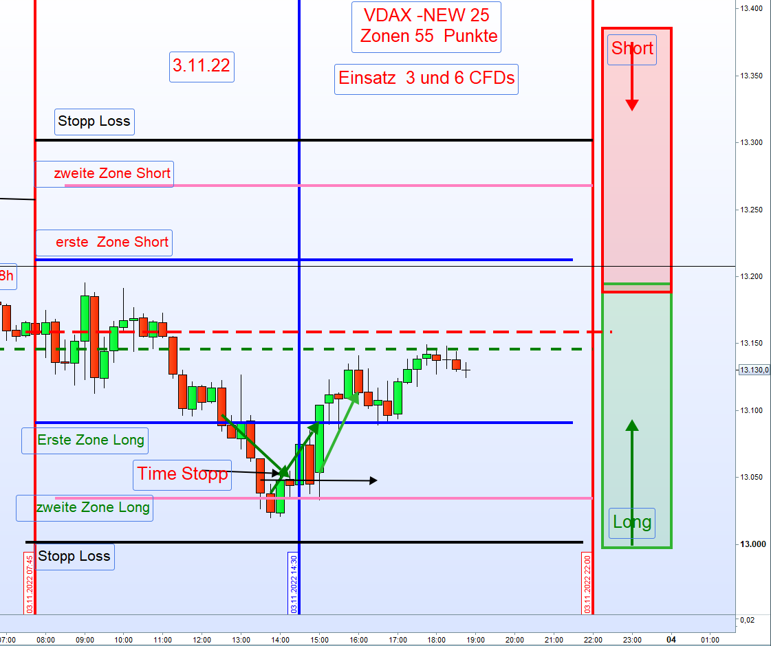 dann wird darüber bei Short im Abstand einer aktuellen Zonenlänge die 2. Zone eingezeichnet sowie Stopp Loss und bei Long eben darunter.