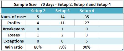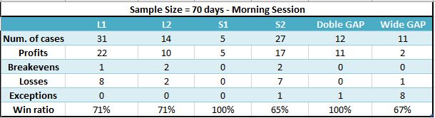 Hasta ahora las mejores zonas para el trading matutino han sido el doble GAP y la primera zona corta (S1), con una efectividad del 100%, aunque hubo muy pocos casos, 5 y 12 de 70 días respectivamente.