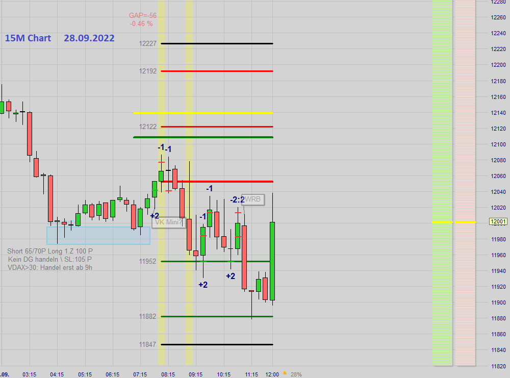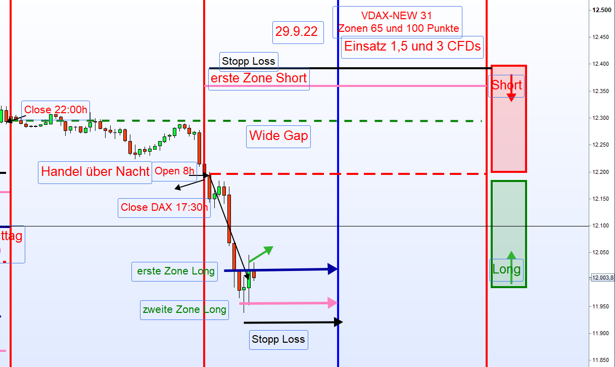 Ich hab das generell immer so gemacht, das ich bei einem VDAX über 30 den Eröffnungskurs immer als Referenzkurz eingestellt habe, so wie heute, egal, ob Doppel Gap oder nicht und den SK (Schlusskurs) dann nicht berücksichtigt bei der Zoneneinteilung.