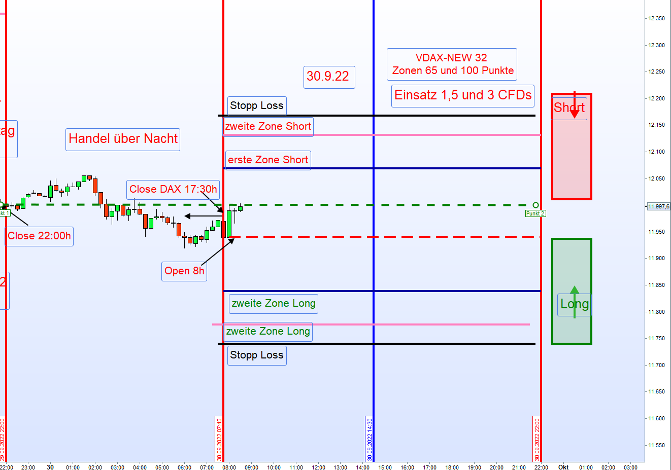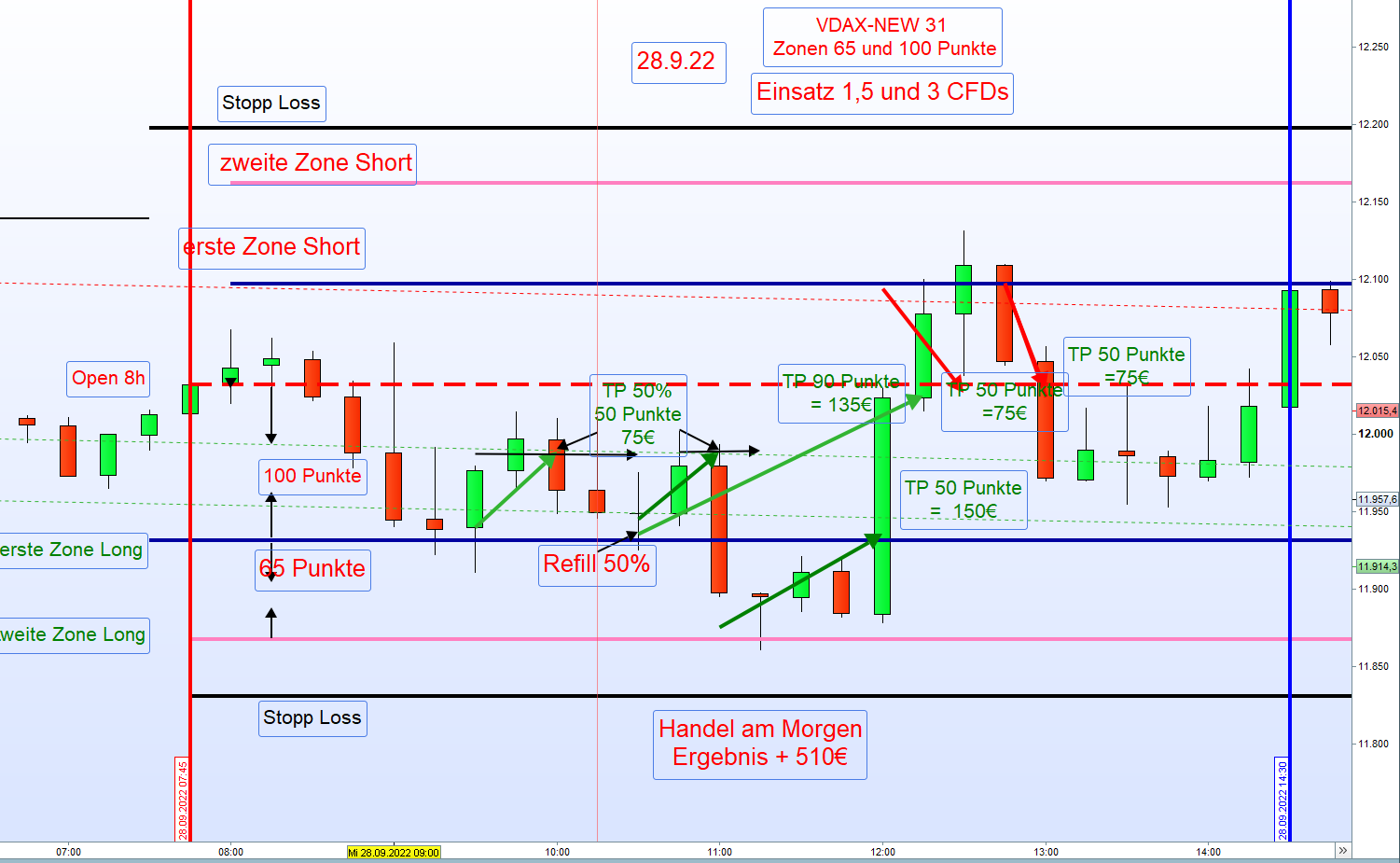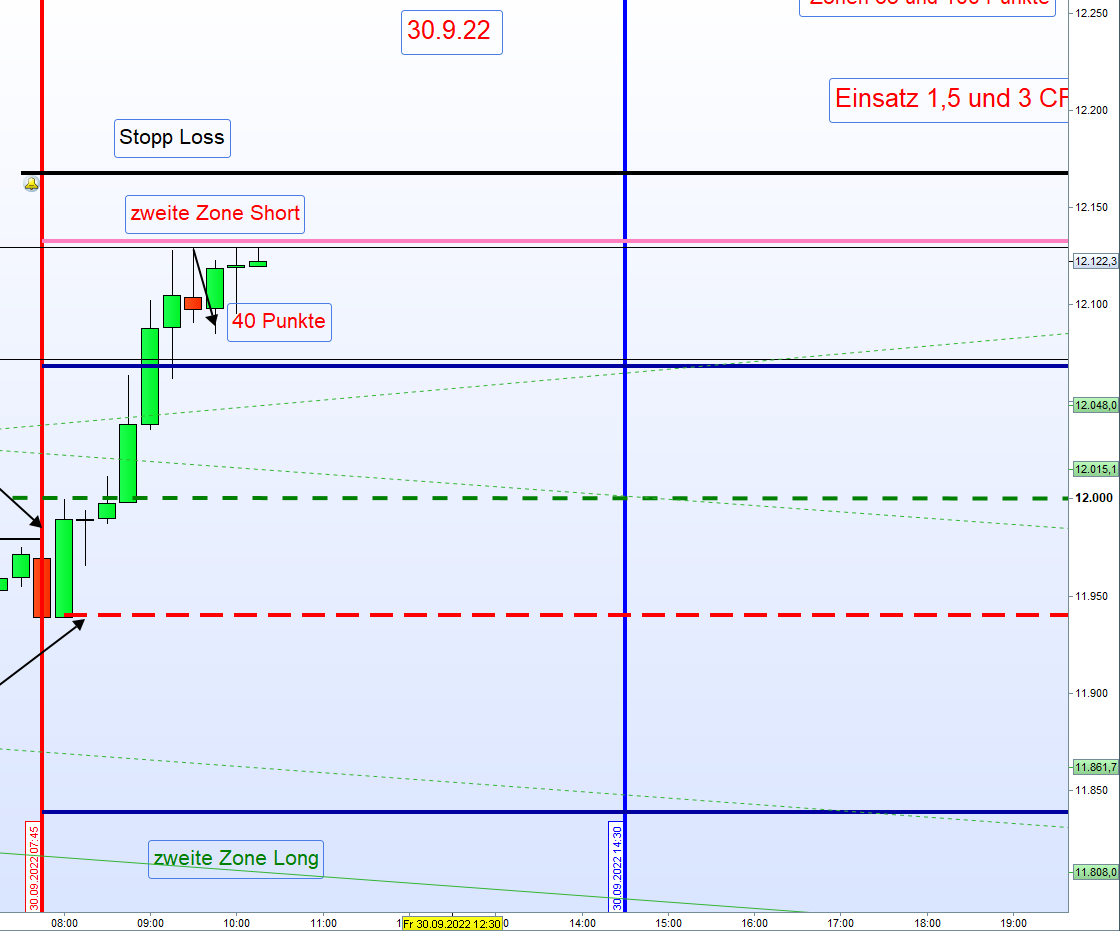 Eine Kursbewegung in Richtung der Zonen ist jeden Tag gegeben. Die Eröffnung einer Position wird von der vollen Kerze beginnend um 7:45h bestimmt. Diese sollte mindestens die Hälfte der tagesgültigen Zonenbreite ausmachen. Zu diesem Zeitpunkt sollte dann für Long der Kurs am oder nahe dem höchsten Punkt der über-Nacht Bewegung notieren. Invers für Short. Die DOW FUT sollten in die gleiche Richtung tendieren. Dieser Einstieg ist dann die erste Zone.Nach Gewinnmitnahme (TP), eingeleitet durch eine Umkehr-kerze, kann dann dort der Zonenhandel erfolgen.