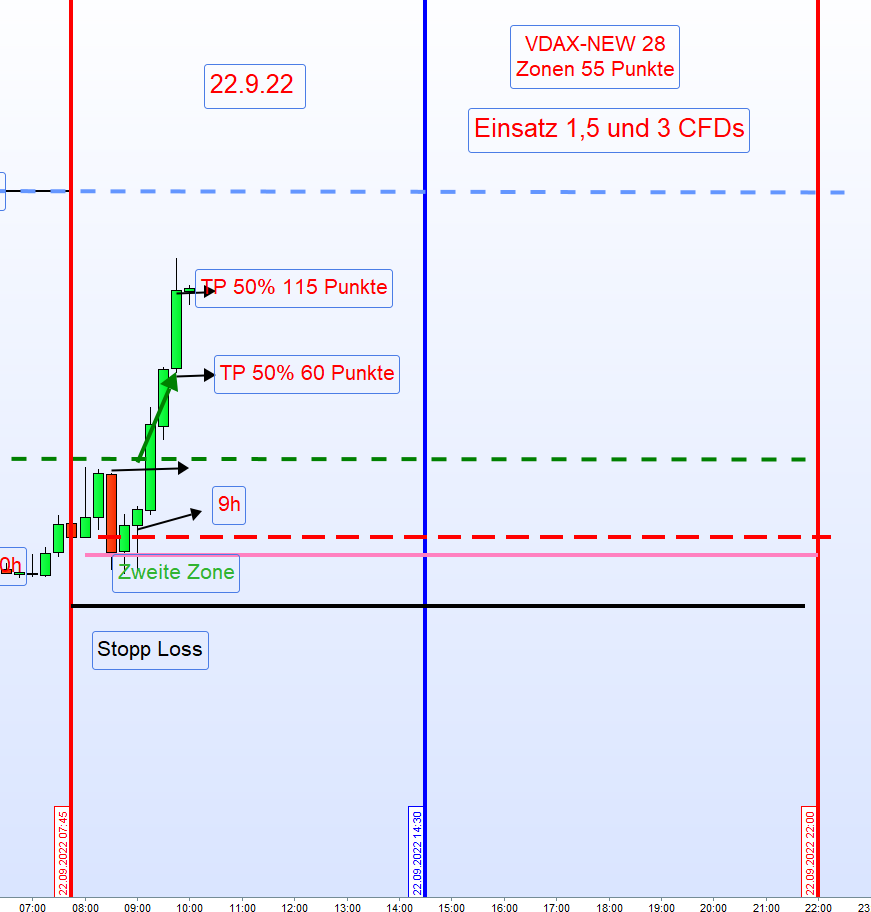 Eine Kursbewegung in Richtung der Zonen ist jeden Tag gegeben. Die Eröffnung einer Position wird von der vollen Kerze beginnend um 7:45h bestimmt. Diese sollte mindestens die Hälfte der tagesgültigen Zonenbreite ausmachen. Zu diesem Zeitpunkt sollte dann für Long der Kurs am oder nahe dem höchsten Punkt der über-Nacht Bewegung notieren. Invers für Short. Die DOW FUT sollten in die gleiche Richtung tendieren. Dieser Einstieg ist dann die erste Zone. Nach Gewinnmitnahme (TP), eingeleitet durch eine Umkehrkerze, kann dann dort der Zonenhandel erfolgen.