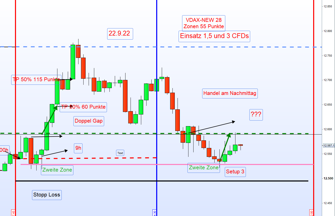 Aber hier sieht man gut, wie ich finde, wenn man mit festen Profit-Zielen arbeitet, besonders am Morgen ist der Markt zuerst uneinheitlich. Dann handelt man zuerst Short mit 1. TP50% 30 P und 2. TP50% auf eine Zonenlänge (ZL) und hier in dem Beispiel anschließend wieder Long an der "neuen" Zone 1...