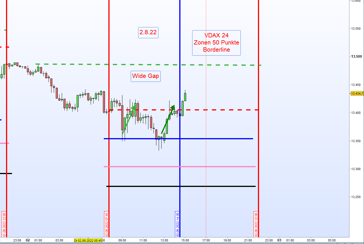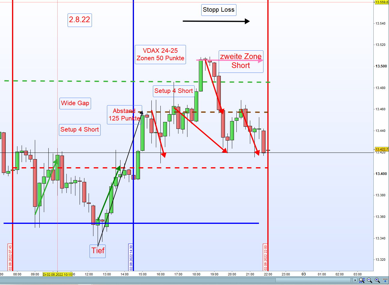 Das heißt, die horizontale Linie ist die Mindest-Handelspanne von 125 Punkten und diese kann durchaus zeitlich später im Verlauf des Nachmittags erst vom Kurs erreicht werden und ab da wird Setup 4 gehandelt oder weitere Zonen darüber.