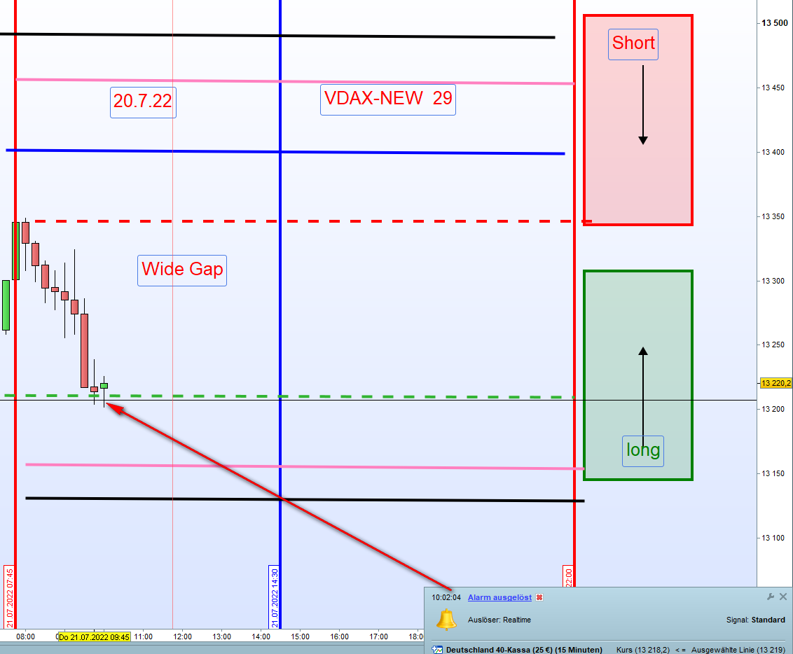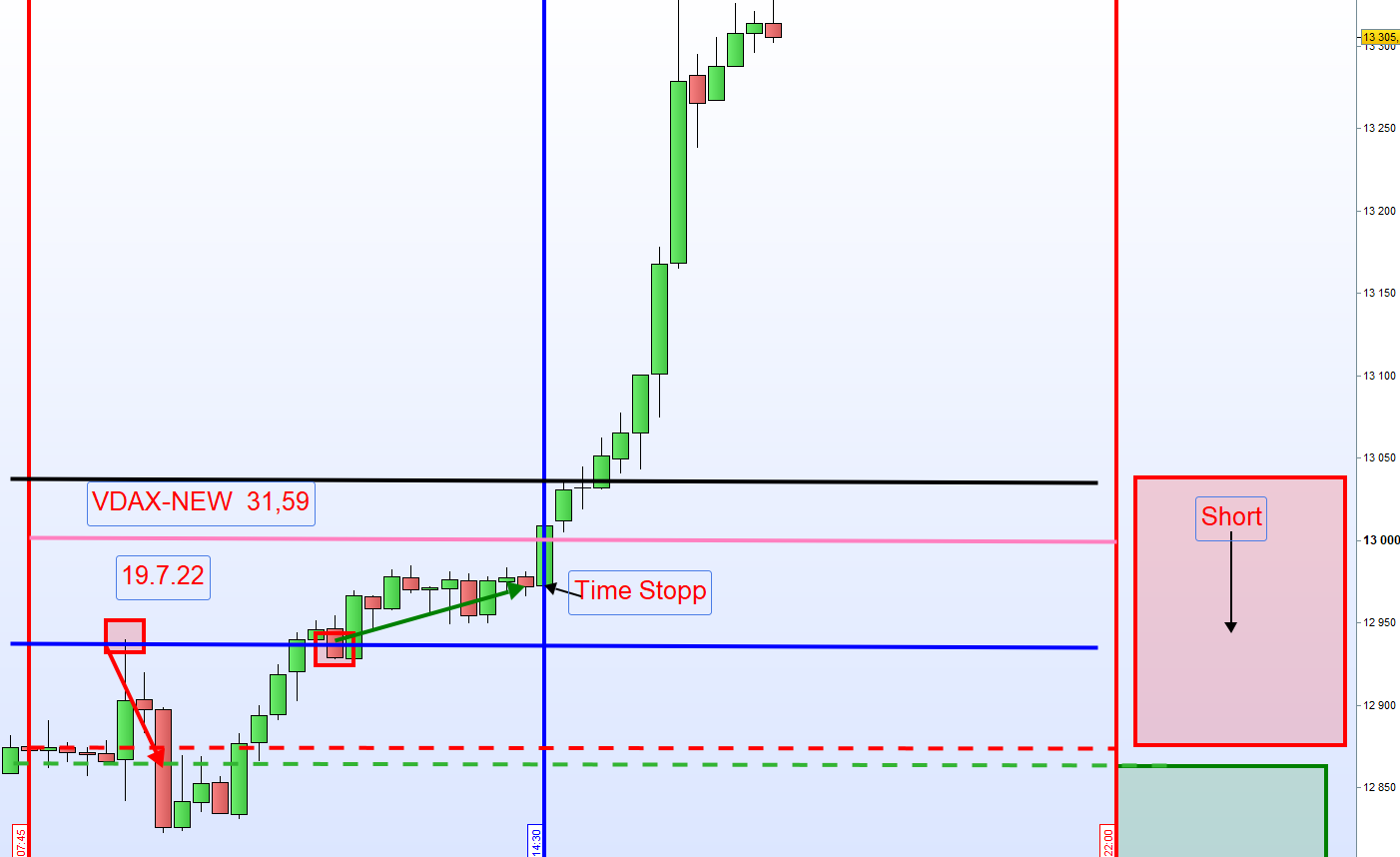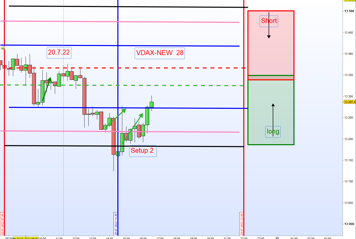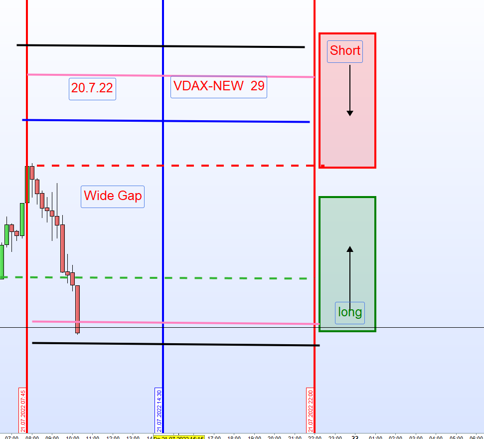 Normalerweise bei einem VDAX über 20, sollte der Kurs zuerst einmal unter die Zone laufen und dann wird im Rücklauf eine Stopp Order gesetzt und zwar 5 Punkte oberhalb der Zone für Long.