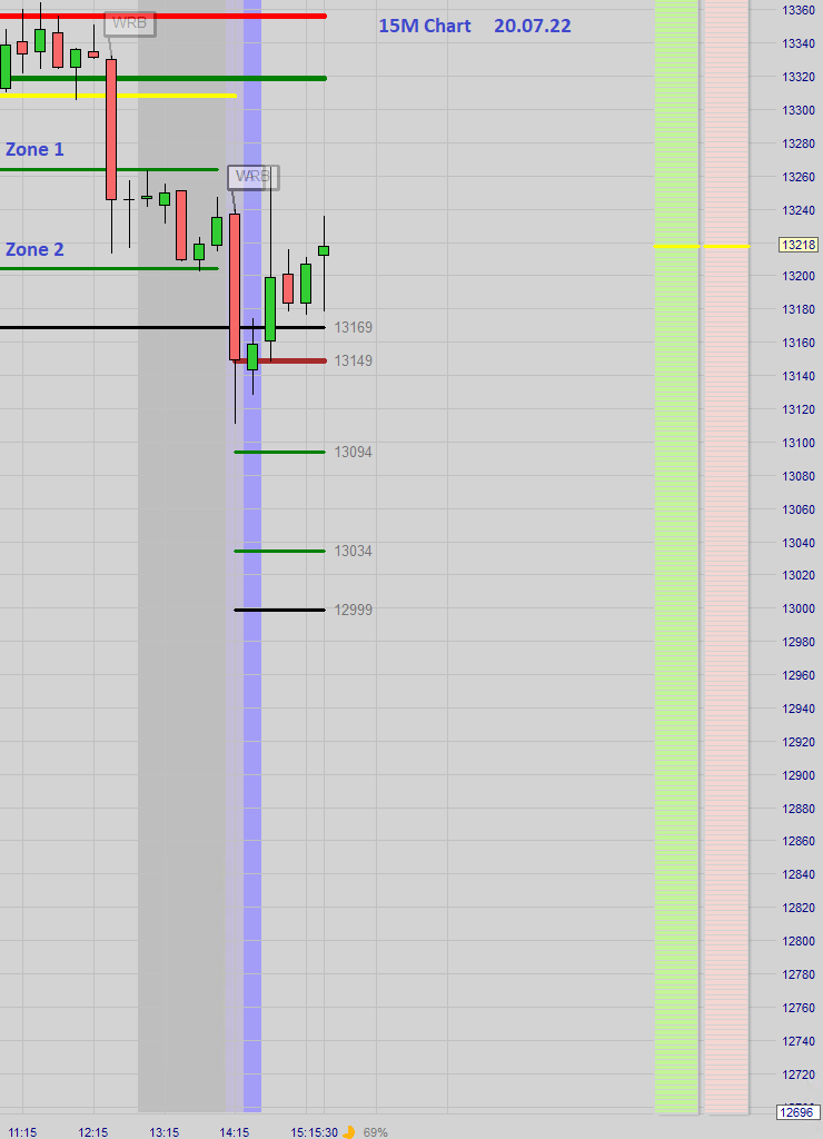 Zudem schaue ich mir die sog. WRB Kerzen an (Wide Range), also sehr lange 15M Kerzen die auftauchen, die nahe oder min. eine Zonenlänge lang sind und wie heute die Zone 1 durchschritten hat.