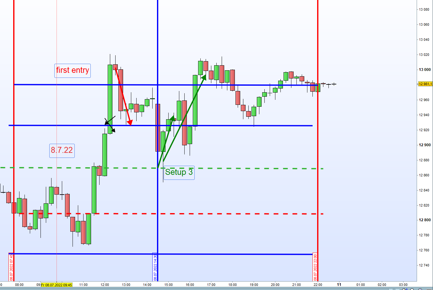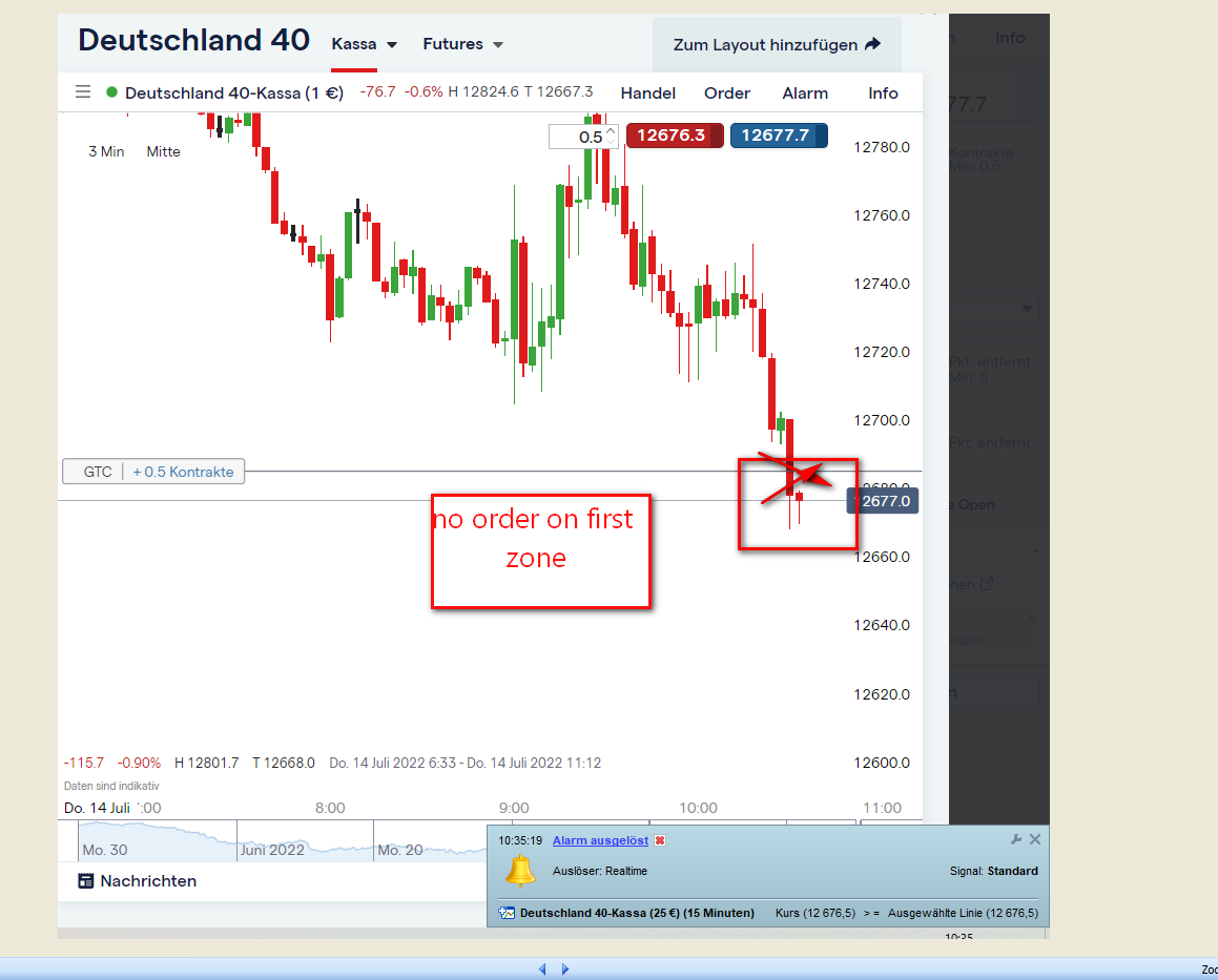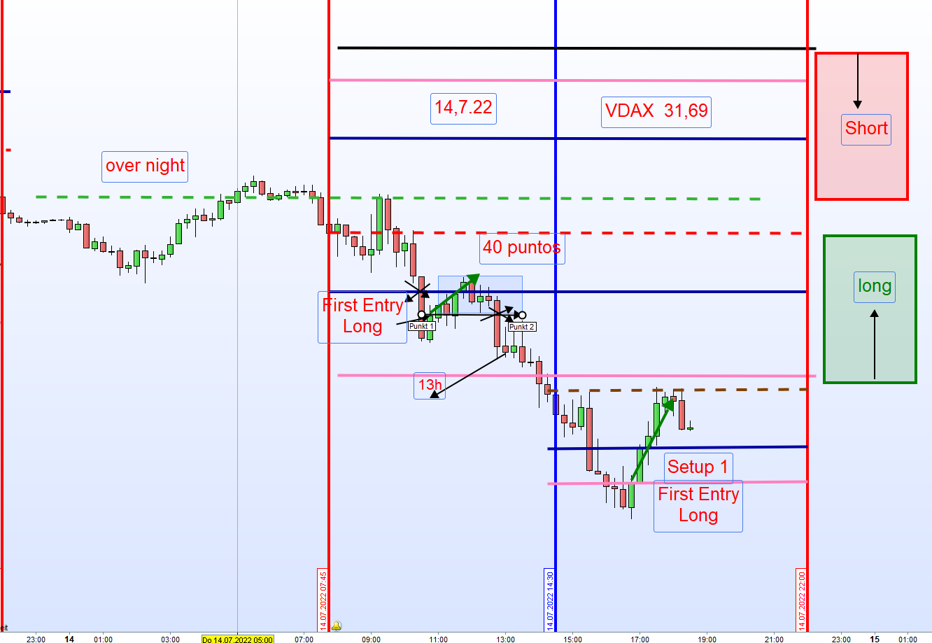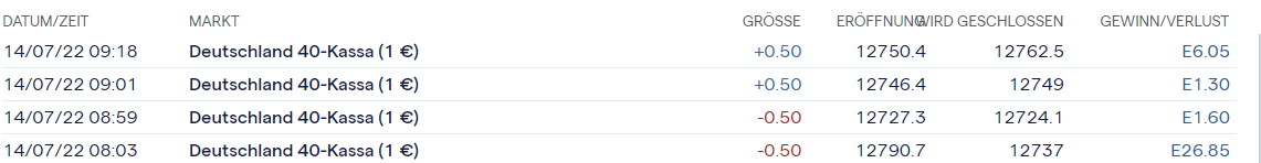 Nach Eröffnung der Long Position notierte diese 40 Punkte im Plus. Sofern keine Mitnahme eines Teilgewinns darf diese nicht in den Verlust laufen. Nach 13h keine neue Eröffnung einer Position.