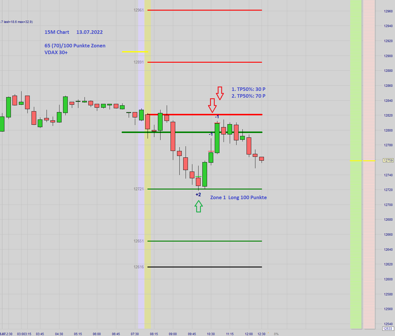 Ansonsten: Notiert der VDAX über 30 wird eine Doppel Gap nicht gehandelt, jedoch erfolgt der Zonenhandel mit Einteilung als Referenz der Eröffnungskurs um 8:00h.