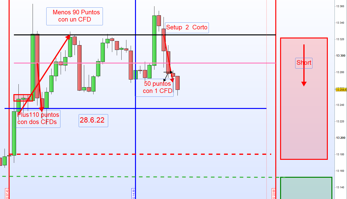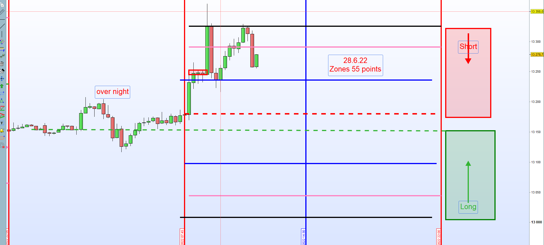 Liegt dieser XETRA-Kurs im Bereich von 100 Punkten unter dem Eröffnungskurs, dann dient dieser als Einstieg LONG und somit zur ersten Zone.