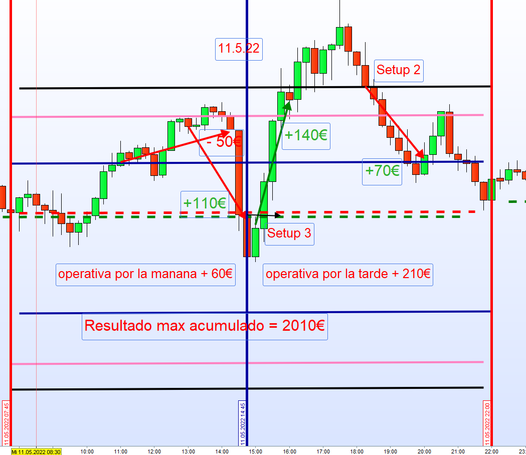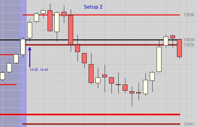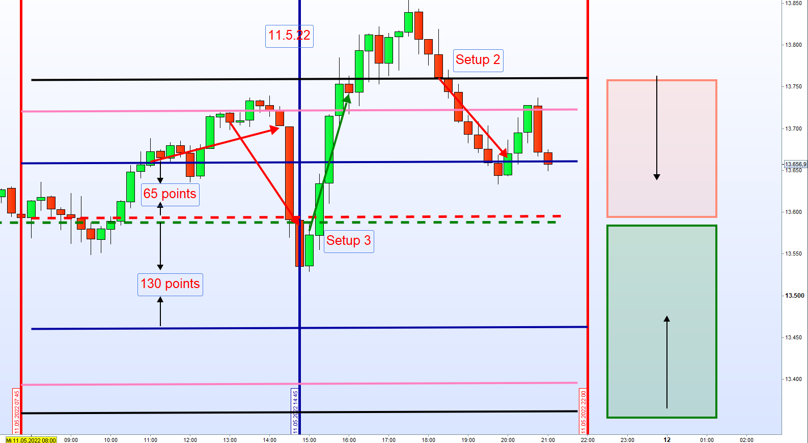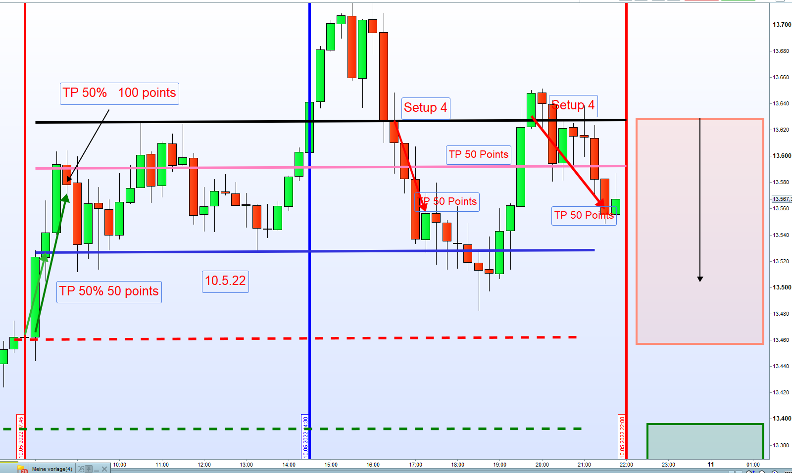 2. Trade: Setup 4 Long um 15:00 h: Am Nachmittag erfolgte ein Einstieg mit 30 Punkte TP50% und die weiteren TP50% auf Zonenlänge (heute 65 bzw. 70 Punkte).