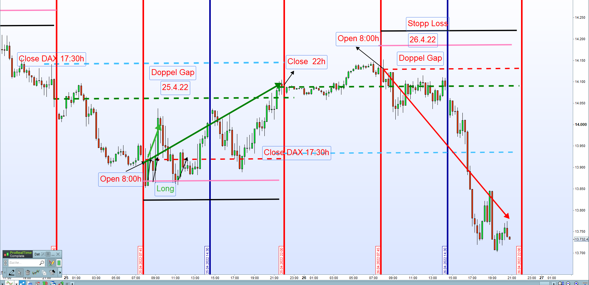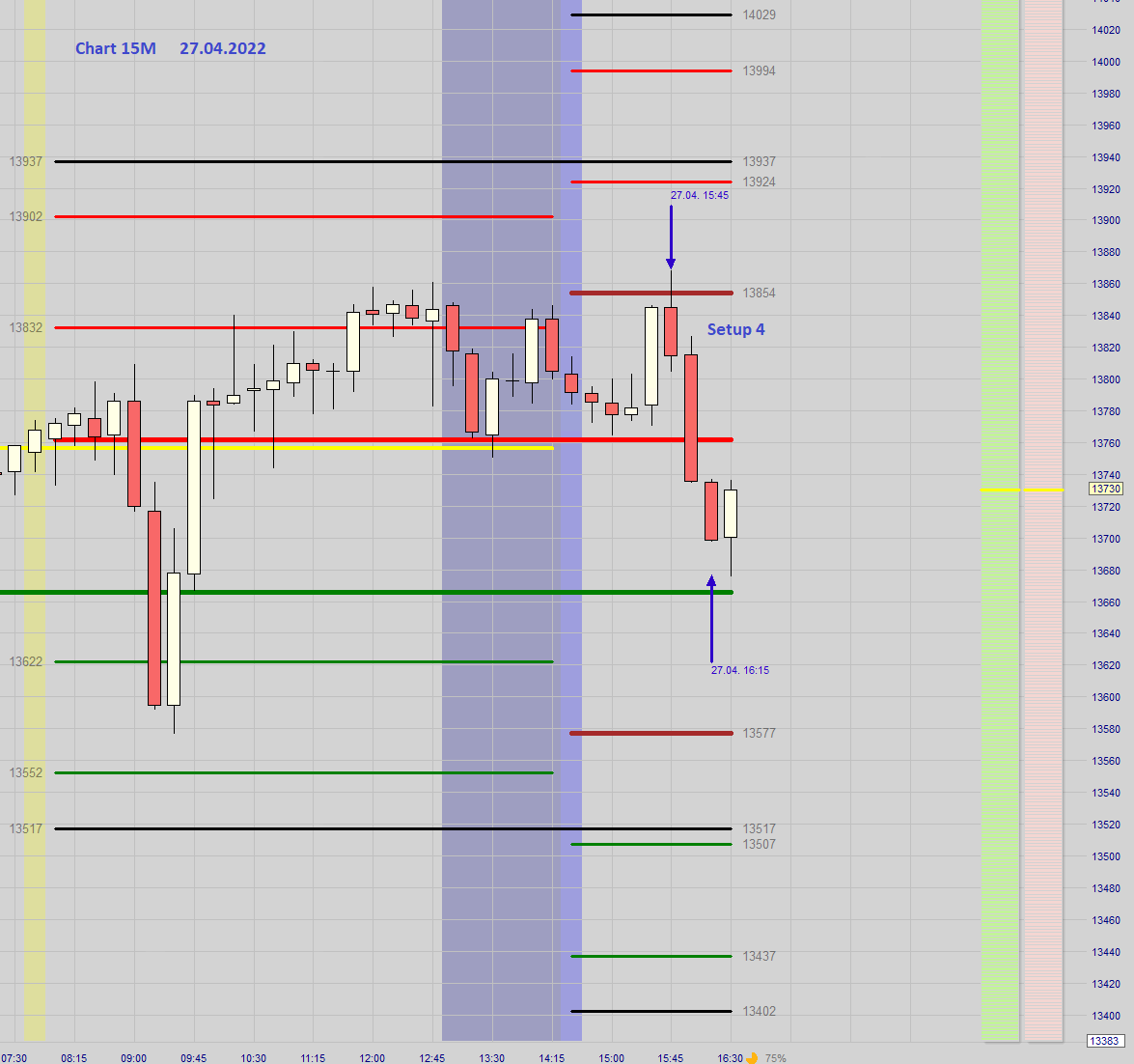"Heute geht wohl der Dax eher in Richtung der Short Zonen. -> keine Vermutungen, sondern in den Chart schauen und wenn der Kurs an Short-Zone nach Regeln verläuft, dann einen möglichen Einstieg suchen