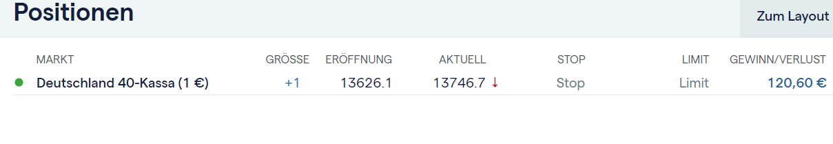 1. Ja die zwei Longs heute vormittag habe ich mitgenommen. Mit der 0.5 Kontrakt bei meinem Anbieter ca. 50 Euro gewinn. Sieht erstmal gut aus.