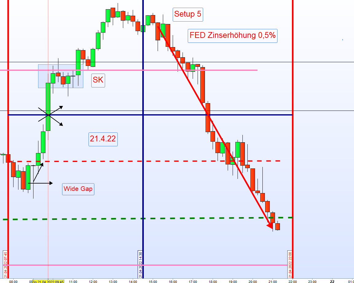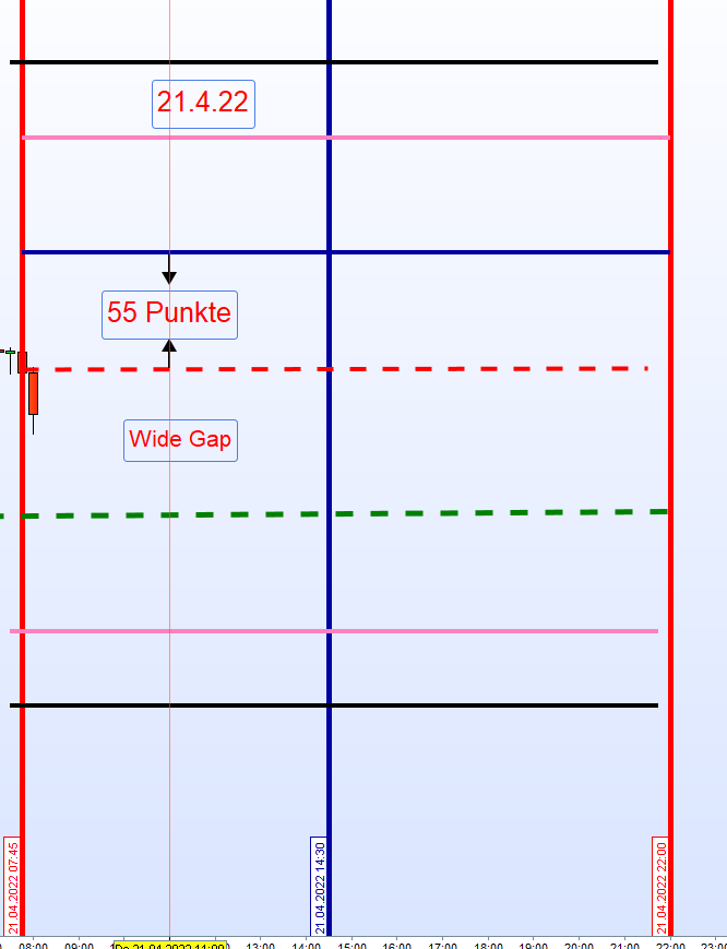 ich würde dich gern zum Verständnis etwas zum Wide Gap fragen. Das Wide Gap wird ja vom Schlusskurs Vortag (SK grün) zur Eröffnung (EK rot) gehandelt, also Long, wenn der Kurs zum Schlusskurs runter fällt und dann steigt, um das Gap Reverse zu schliessen.