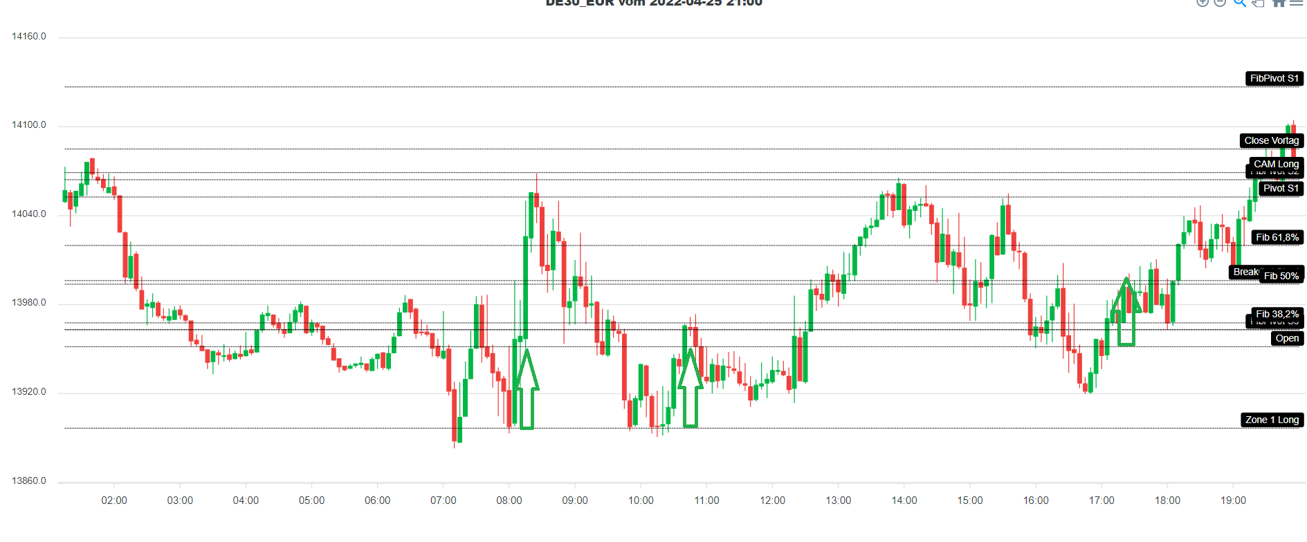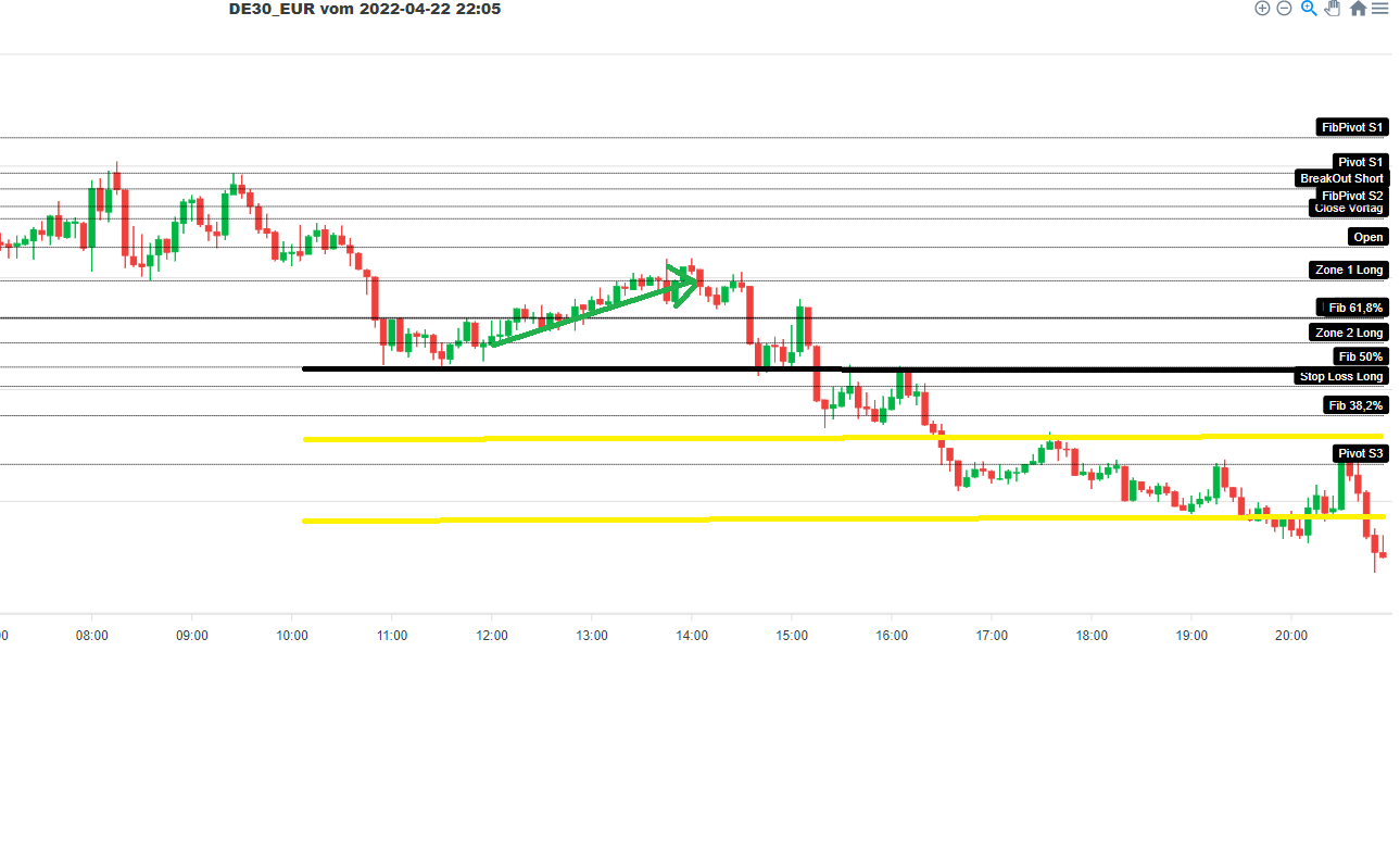 Im Dax Chart von heute sind drei grüne Pfeile. 2 mal hätte der Zonenhandel am Vormittag ins Schwarze getroffen und einmal am Nachmittag sind wir über den Eröffnungskurs gestiegen. Hier wäre er haarscharf am 35 Punkte stop vorbeischrampt aber hätte den auch ins Ziel gebracht.
