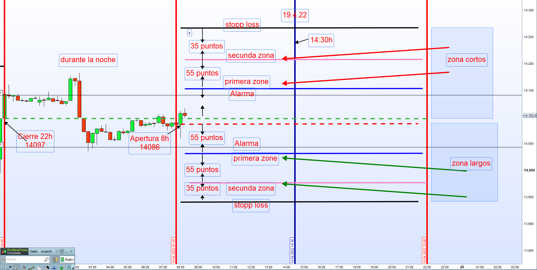 Bleiben wir zuerst bei der normalen FDAX_TRADING-STRATEGIE mit Zonen wie unten eingezeichnet.