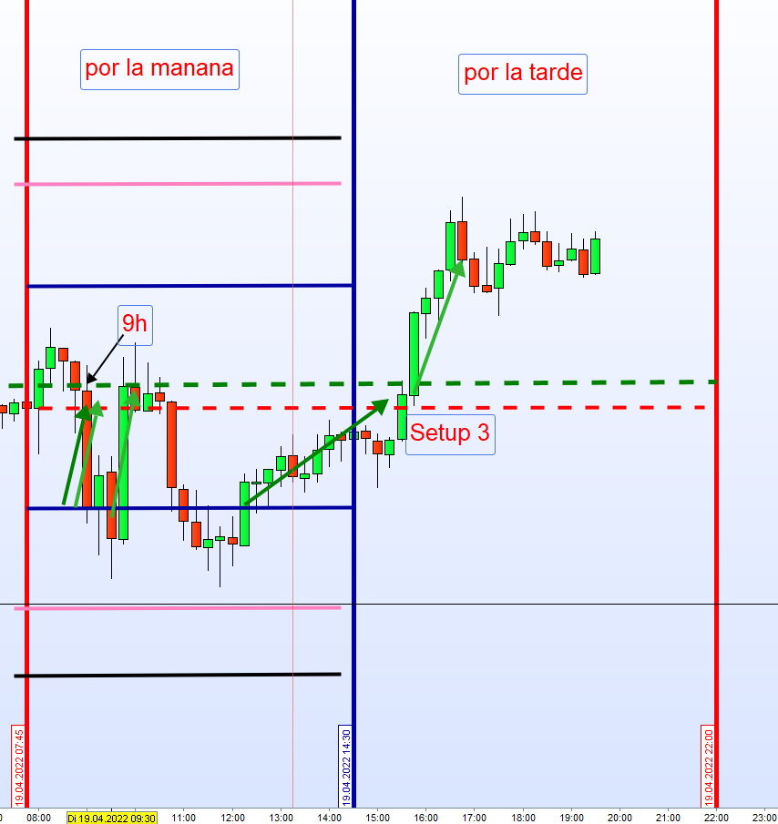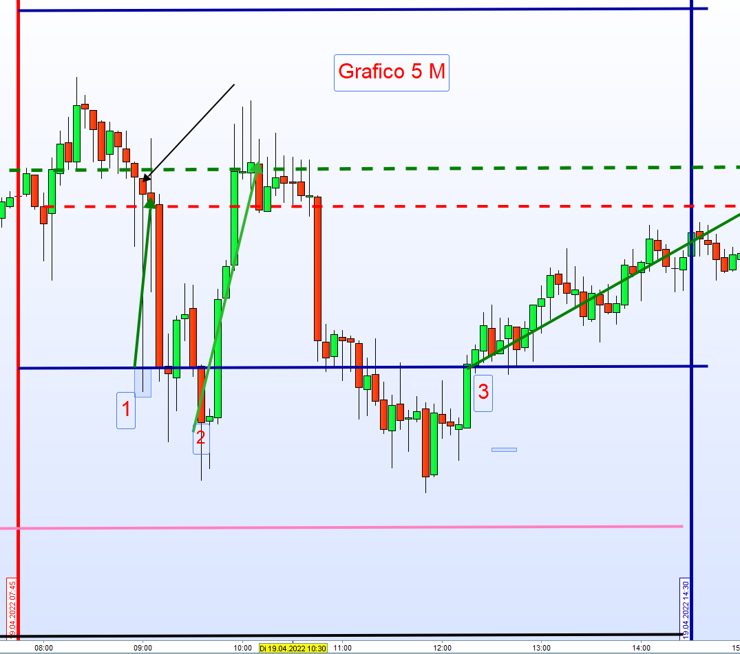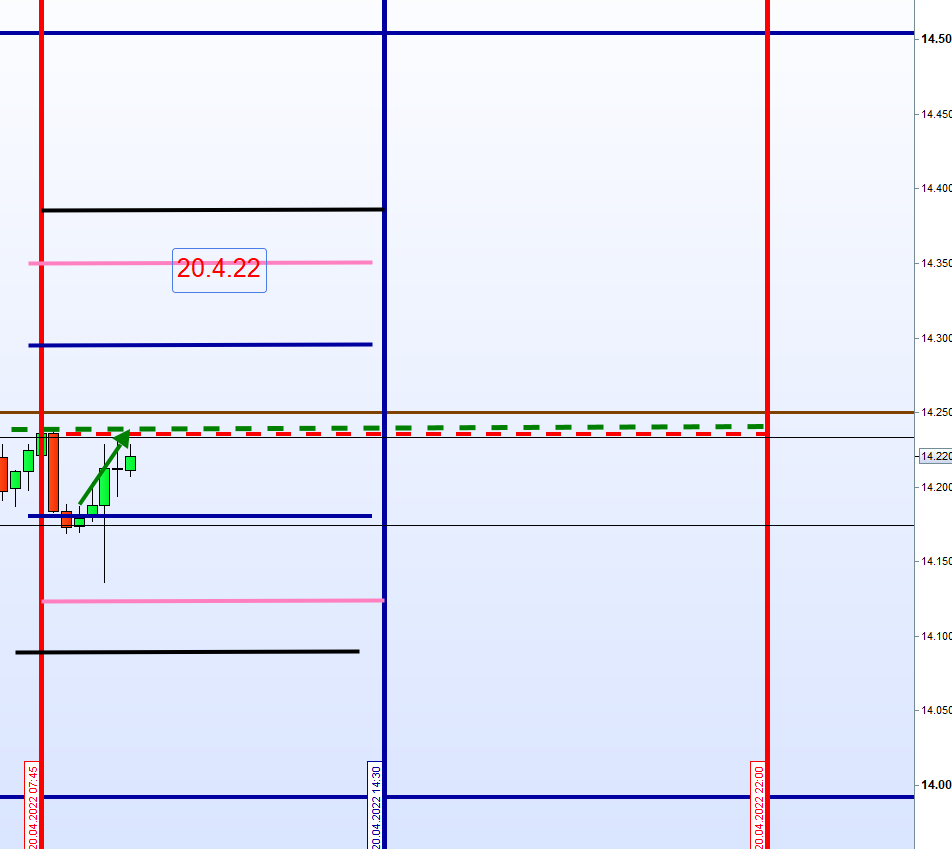 Heute wurde die erste Zone mit 55 Punkten zwei Mal erfüllt. Vom 15M Chart nicht zu erkennen, denn die 9h Kerze ging runter, hoch und wieder runter. Also ohne Tick Chart nicht zu ersehen. Werde heute Abend detailliert darstellen.
