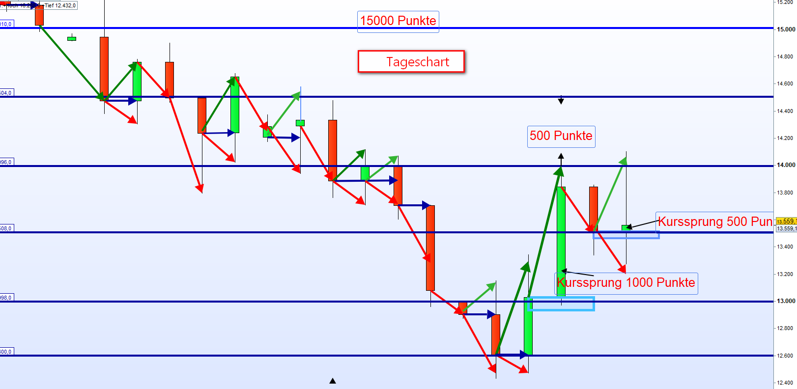Ein Tageschart ist ein Chart nur für den Tag und es spielt keine Rolle, ob für Aktien oder Indexe wie zum Beispiel für den FDAX. Bitte beschäftige dich einmal mit Candlestick Formationen allgemein