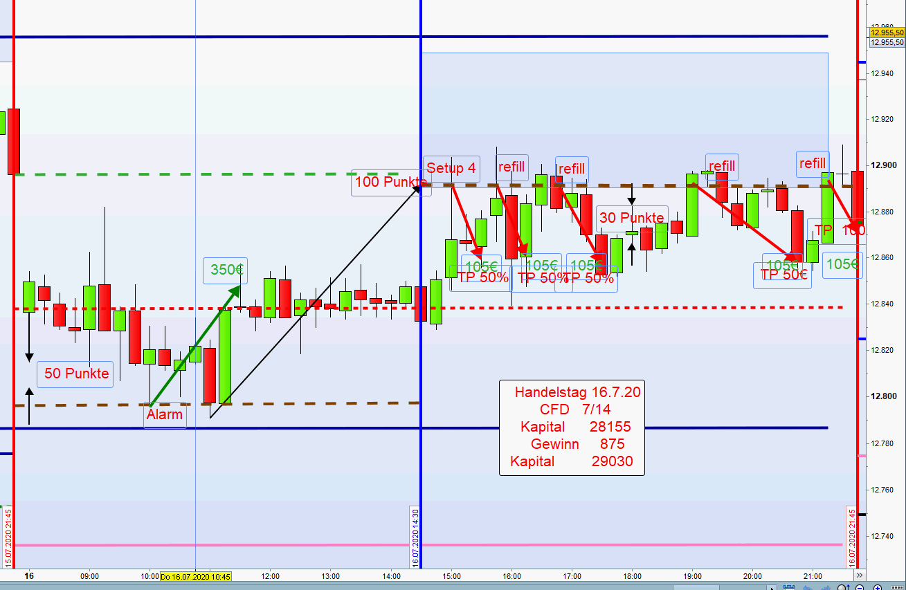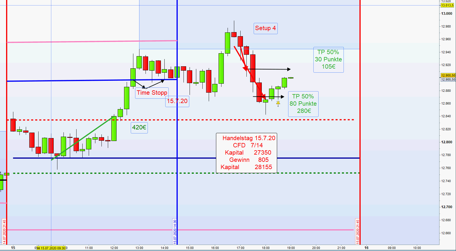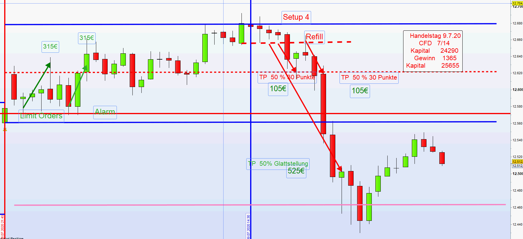 Zuweilen ergibt sich nachmittags die Möglichkeit mehrere Setups in Folge zu handeln Wurde nachmittags ein Setup erfolgreich abgewickelt, dann sollte der nächste Einstieg nur auf der anderen Chartseite sein. Dies vermeidet Over Trading. -