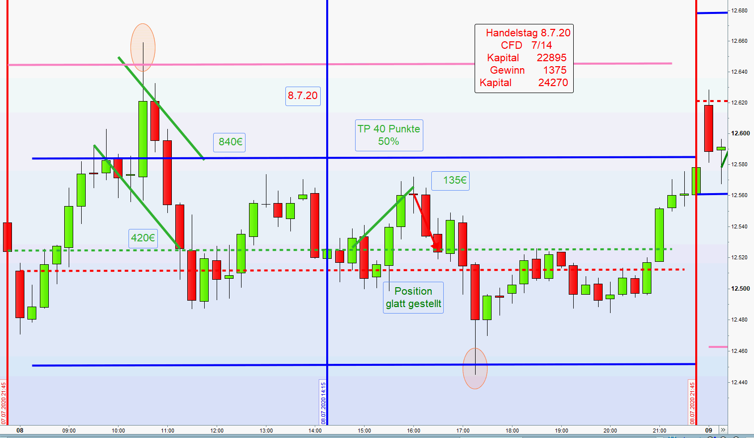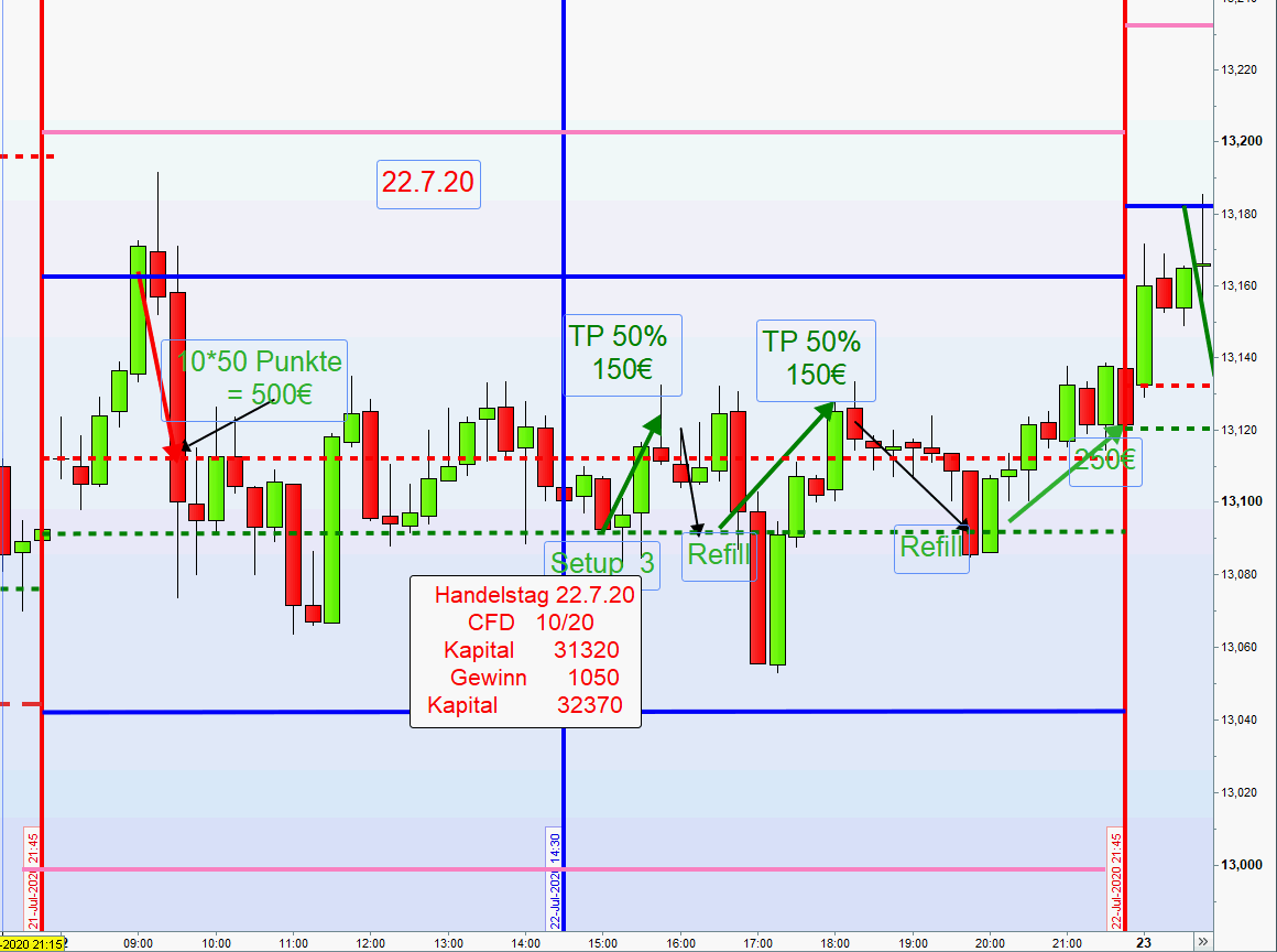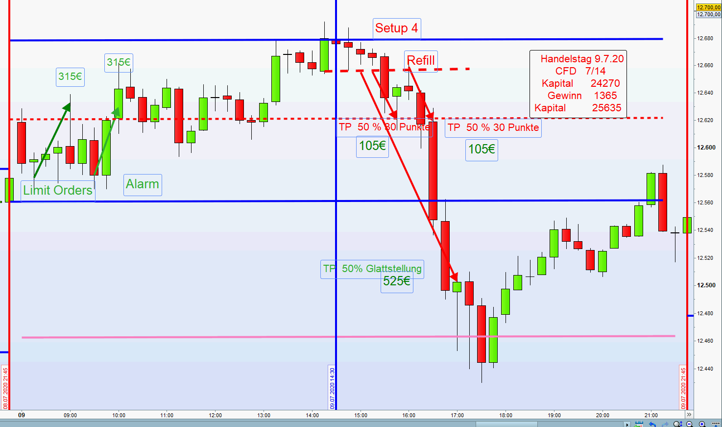 Zuweilen ergibt sich nachmittags die Möglichkeit mehrere Setups in Folge zu handeln Wurde nachmittags ein Setup erfolgreich abgewickelt, dann sollte der nächste Einstieg nur auf der anderen Chartseite sein. Dies vermeidet Over Trading. -