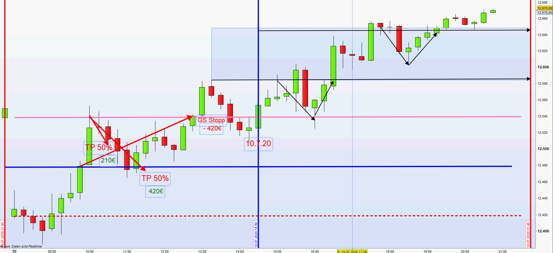 Es war heute früh zu spüren, dass der Markt die Kurslücke schließen wollte. Daher wurde auch eine seltene Gewinnmitnahme von 50% von der zweiten Zone aus vorgeschlagen. Nachdem doch noch ein hübscher Gewinn erzielt werden konnte galt es diesen zu sichern. In Konsequenz wurde die noch offene Position aus der ersten Zone mit einem GS Stopp geschlossen.