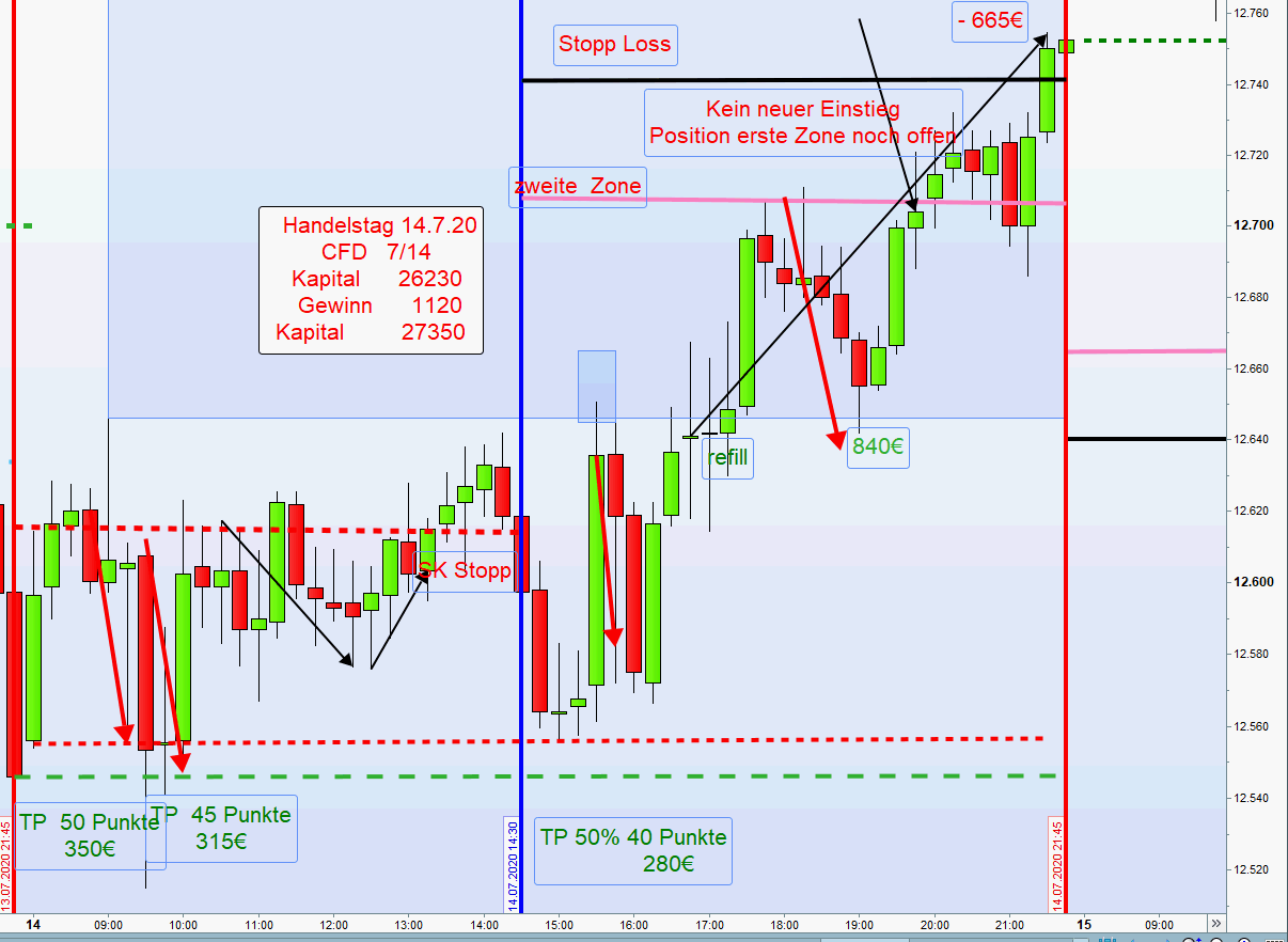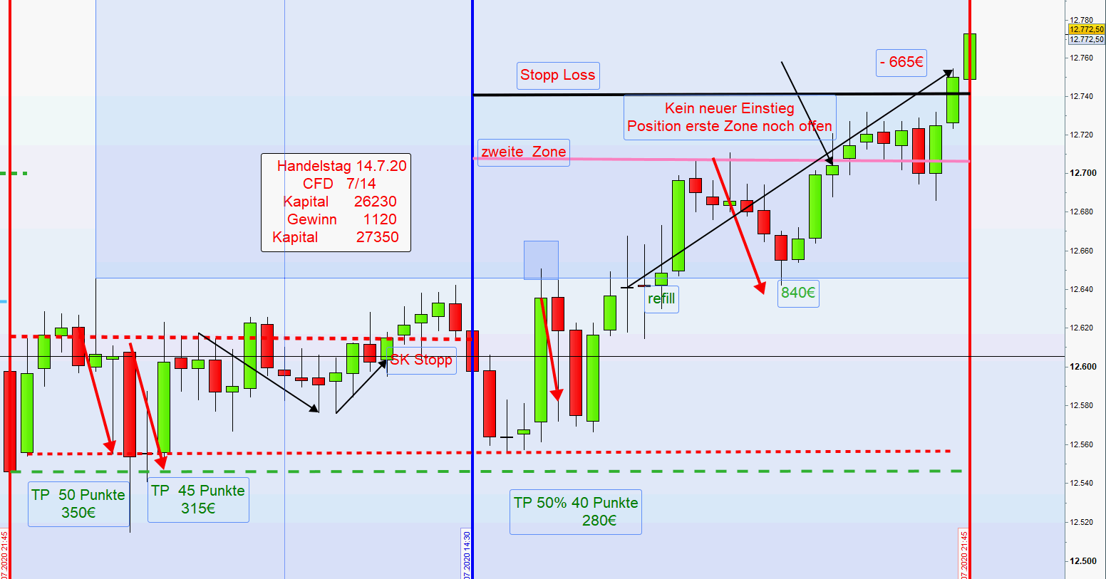 im Laufe des morgens dann unweigerlich im Stopp Loss. So auch heute. Meistens erholt sich der Kurs dann wieder und, sofern nur noch die Position aus der ersten Zone offen ist, wenden wir die Regel " Anpassung stopp Loss" an.