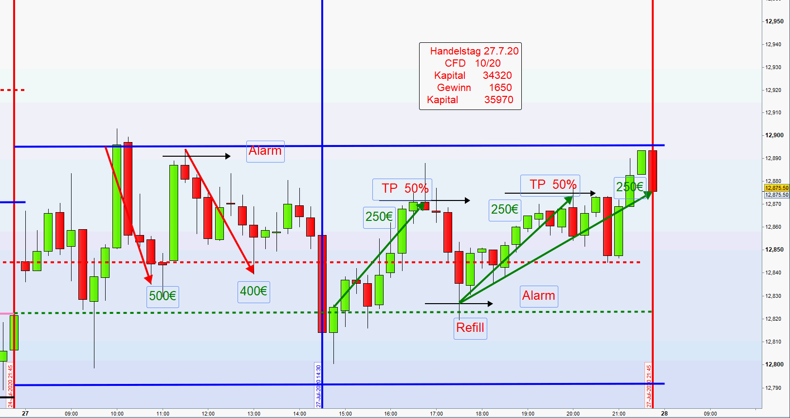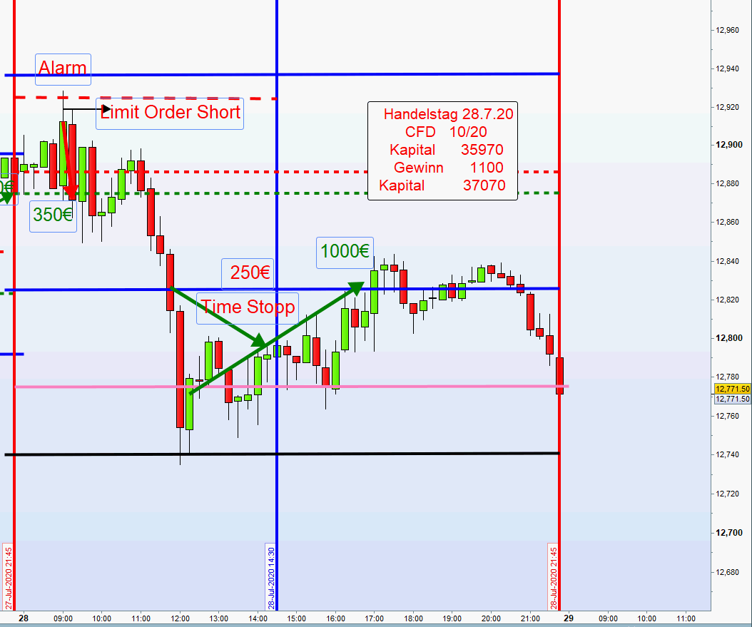2. In den letzten Handelstagen, so auch heute, erfolgte die Positions-Eröffnungen nach dem Alarm mit einer Limit Order.