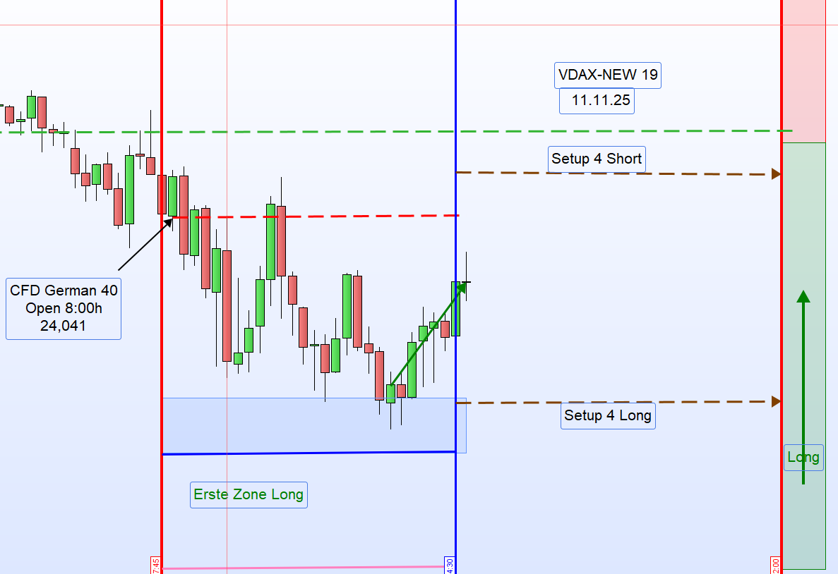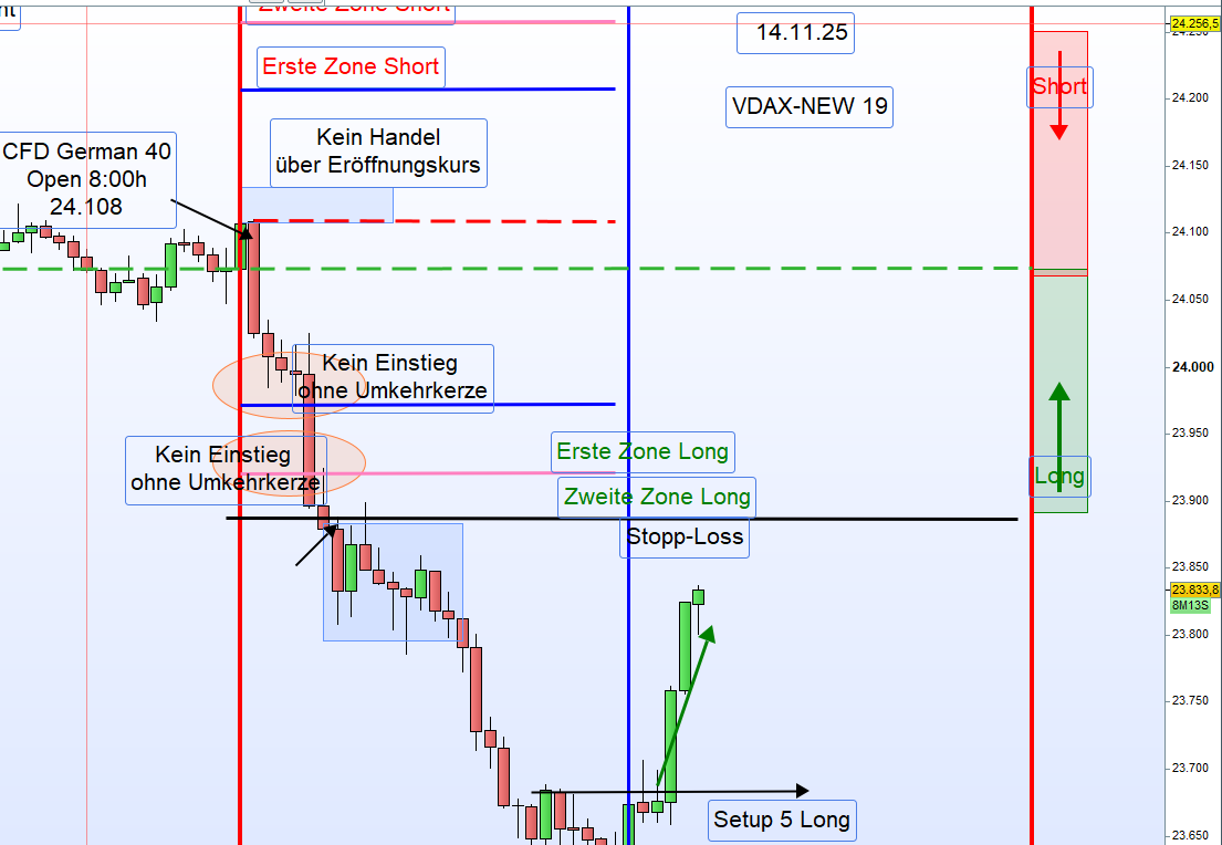 Handelstag 14.11.2025 – German 40 / DAXEinleitung:Der German 40 schloss am 13.11.2025 um 22:00 Uhr mit 24.072 Punkten.Heute, am 14.11.2025 um 8:00 Uhr, eröffnete der Markt bei 24.106 Punkten,was einem Up-Gap von 34 Punkten entspricht.Der VDAX-NEW ist auf 19 gestiegen, was eine zunehmende Volatilität signalisiert.Alle US-CFDs notieren leicht im Minus.Hinweis:Gestern wurde an der US-Börse die Einschätzung abgegeben, dass der Feds (US-Notenbank) December Rate Cut increasingly looks like a toss-up –also, dass eine Zinssenkung im Dezember plötzlich wieder völlig offen erscheint.Dies führte zu Korrekturen im US-Markt.Erstaunlich ist jedoch, dass es über Nacht keine Fortsetzung dieser Bewegung gab.