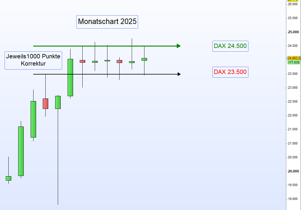 Beim Zonenhandel ergeben sich die Zonenweiten von entweder 100 oder 75 Punkten Abstand vom Eröffnungskurs um 8:00 Uhr sowie vom Schlusskurs des Vortags um 22:00 Uhr auf Basis von Wahrscheinlichkeiten und in Abhängigkeit von den aktuellen DAX- und VDAX-Notierungen. Mitunter liegt die Berechnung genau zwischen beiden Varianten, sodass sowohl 100 als auch 75 Punkte möglich wären. Diese Situation wird als Borderline bezeichnet.ZusatzbemerkungEs ist daher möglich, wie im angehängten Chart ersichtlich, eine zusätzliche Zone ober- oder unterhalb der ersten Zone mit 25 Punkten Abstand zu markieren. Notiert der Kurs in dieser zur Aktionslinie vorgelagerten Zone, kann ein erfahrener Trader dort nach dem Erscheinen einer eindeutigen Umkehrkerze Long- oder Short-Positionen eröffnen. Diese Ergänzung erlaubt eine feinere Abstimmung potenzieller Einstiege, besonders in Phasen erhöhter Unsicherheit hinsichtlich der Zonenweite. -