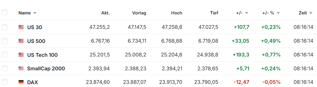 Die CFDs der US-Majors und des DAX notieren heute Morgen alle im Plus.