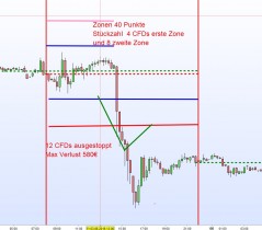 Der Schlusskurs vom Vortag gehört mit zur Trading Range. Wie es der Zufall wollte war dieser somit Tief der Handelsspanne am Morgen. Von dort aus wird die mögliche Range Erweiterung eingezeichnet. Gemäß dem Regelwerk wurde aber zuerst, als Zufall gleichzeitig, Setup 3 und 4 ausgelöst. Dieser Einstieg Long ist nun die erste Zone und darunter wird dann die erste Zone von de Range Erweiterung, blaue Linie, zur zweiten Zone. Nicht im Chart eingezeichnet.