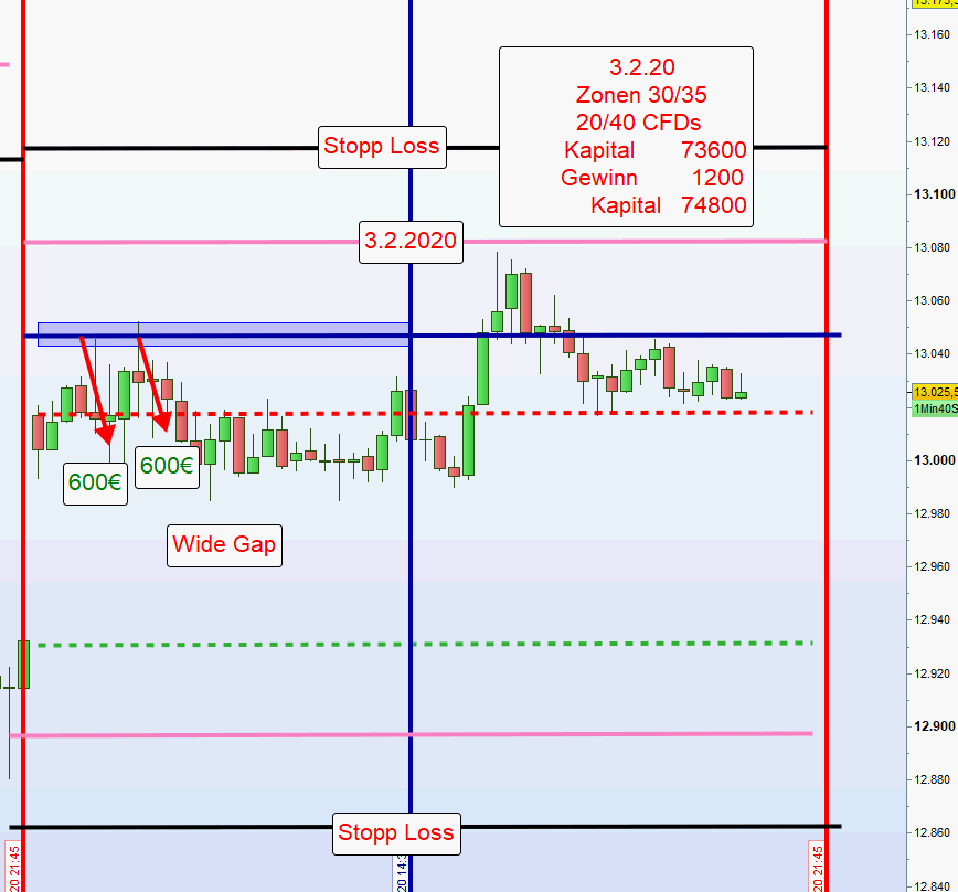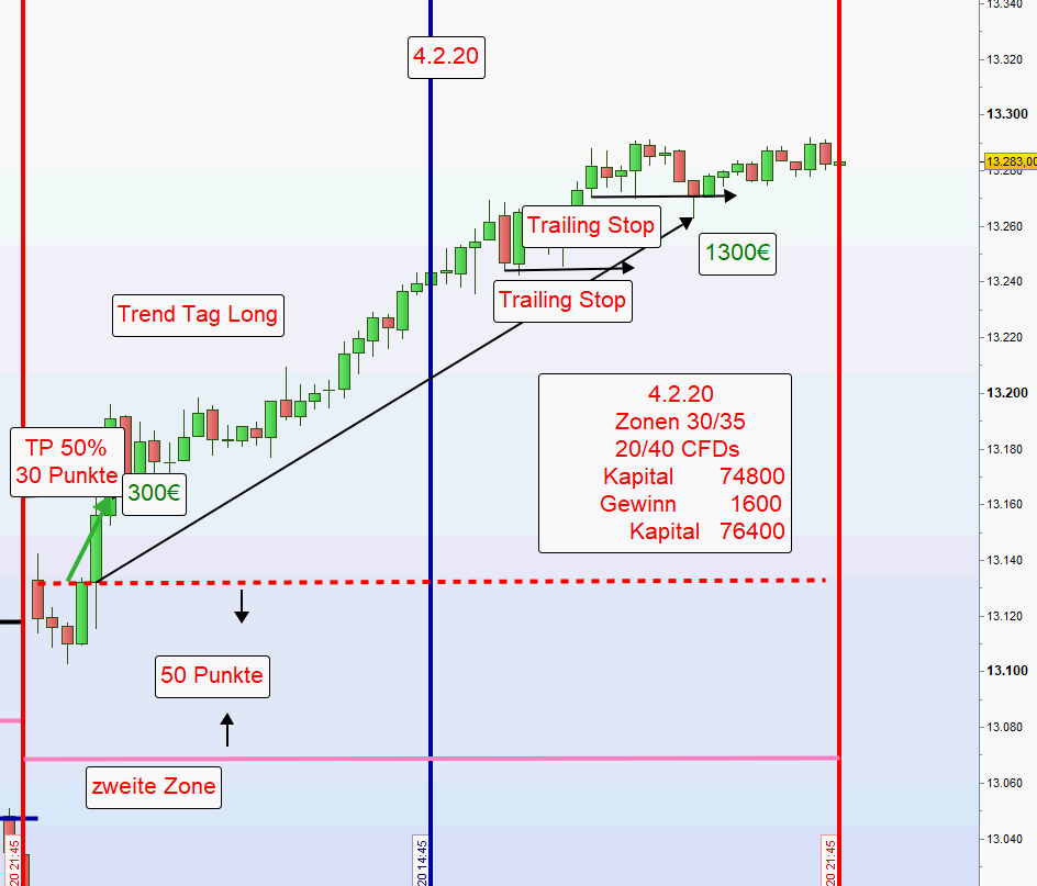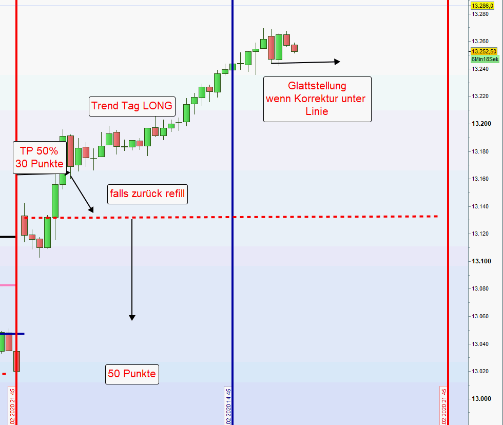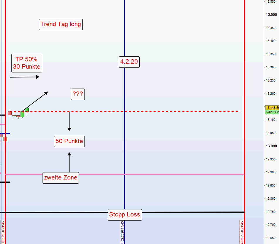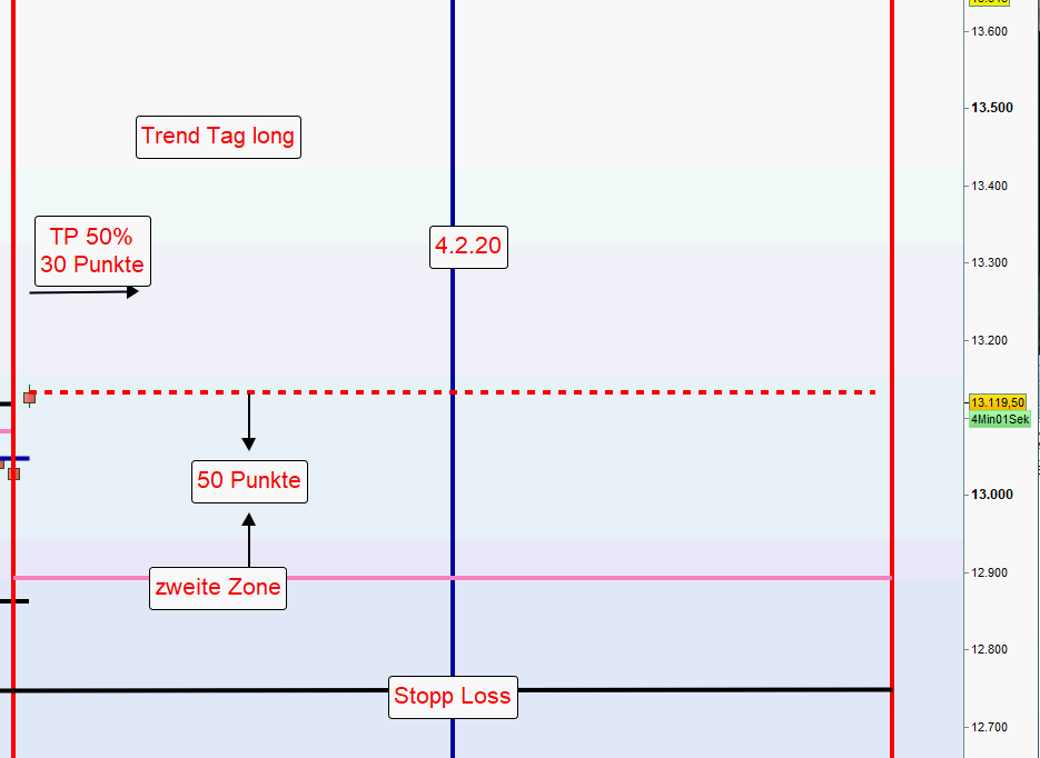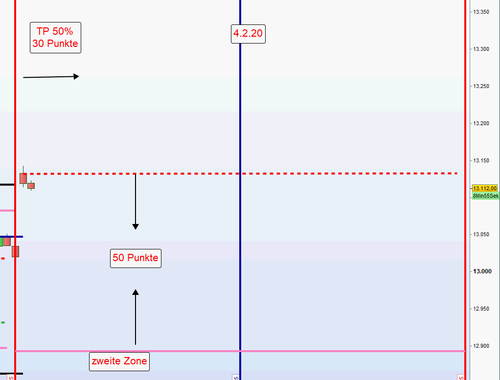 Wird eine Position an der ersten Zone eröffnet und danach festgestellt, dass die erste Zone durchgehandelt wurde und zwischen der ersten und zweiten keinerlei Korrektur erkennbar ist, dann erfolgt ein erneuter Einstieg erst nach einer Umkehrkerze. Sofern diese Umkehrkerze mehr als 10 Punkte unter der normalen zweiten Zone schließt, wird nur noch die Hälfte der Kontrakte eröffnet und der Stopp Loss neu definiert. -