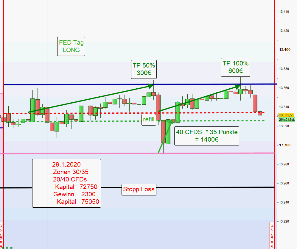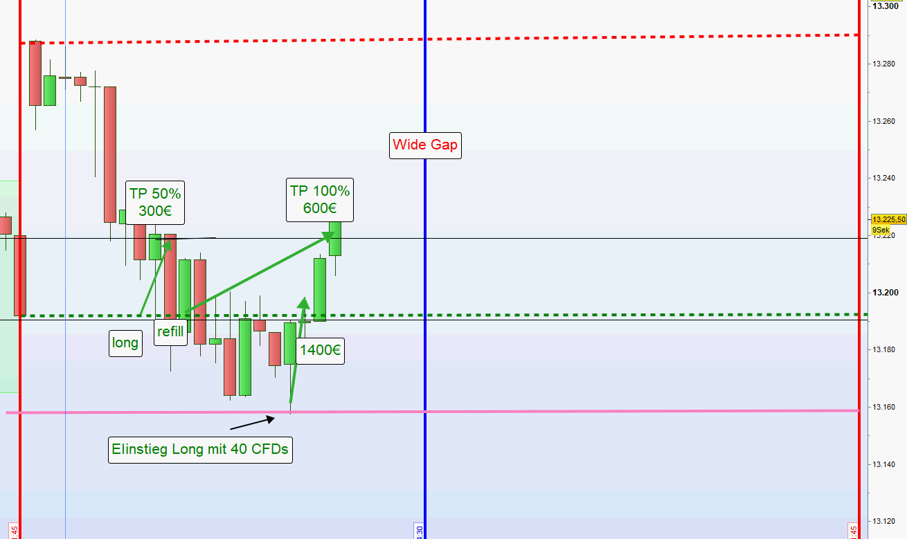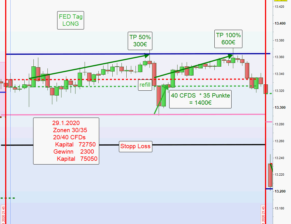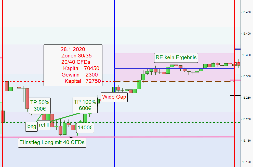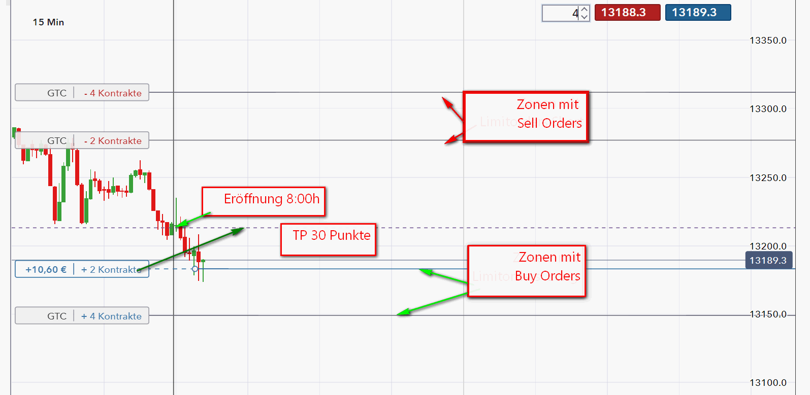Korrigiert der Kurs in die zweite Zone wird eine Position Long verdoppelt und der TP erfolgt für diese Position nach 35 Punkten Gewinn.