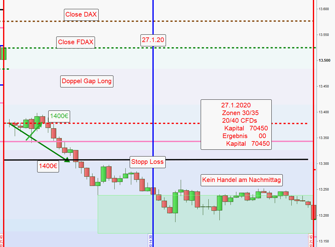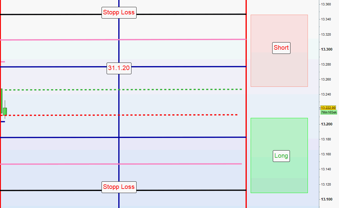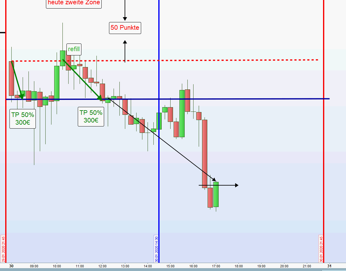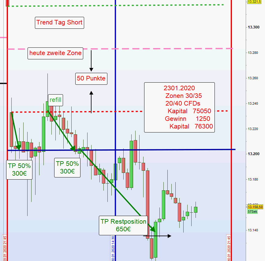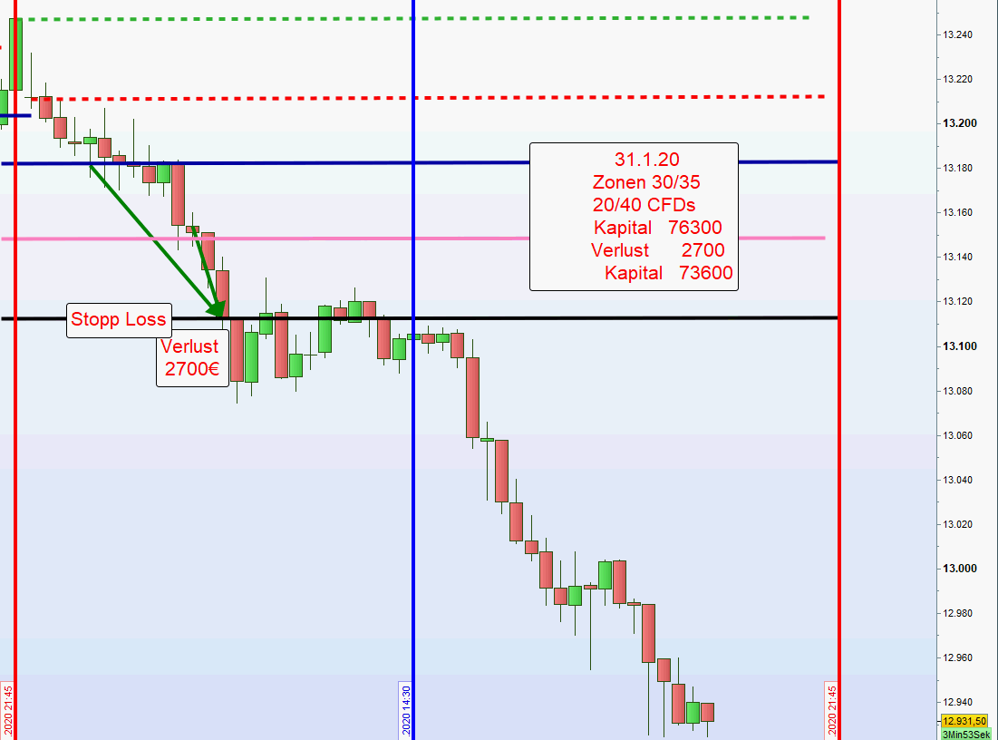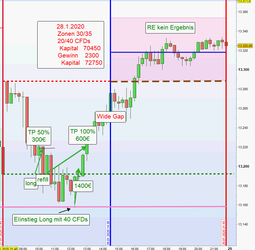 Korrigiert der Kurs in die zweite Zone wird eine Position Long verdoppelt und der TP erfolgt für diese Position nach 35 Punkten Gewinn.