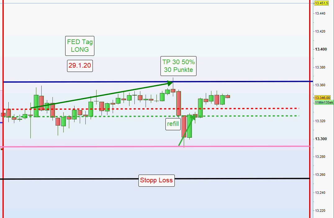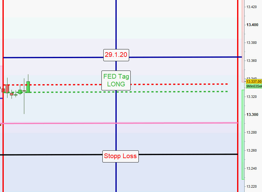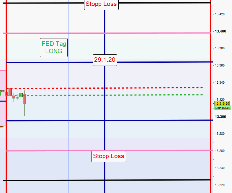 Im Vorfeld wichtiger Veröffentlichungen wie FED Zinsentscheidung kommt es in einem bullischen Umfeld regelmäßig zu Kursgewinnen. Das Federal Open Market Committee trifft sich regulär acht Mal in einem Kalenderjahr. Der Einstieg in eine Long-Position erfolgt an solchen Tagen am Eröffnungskurs sobald eine 5M Kerze den Einstieg bestätigt. Zur Positionseröffnung dürfen die DJIA FUT(DJIA FUT) nicht im Verlust notieren. Auf Short-Positionen sollte vor den Veröffentlichungen verzichtet werden. Allerdings werden an den Long Zonen gemäß dem Regelwerk Longpositionen eröffnet Nach der Veröffentlichung der Daten kommt es gewöhnlich zu weiten Kursausschlägen. Nur sehr erfahrene Trader sollten dann noch aktiv werden denn es kommt darauf an ob die Daten bedeutend über oder unter den Erwartungen liegen. Es muss dann zwingend im Tandem mit den DJIA FUT gehandelt werden.