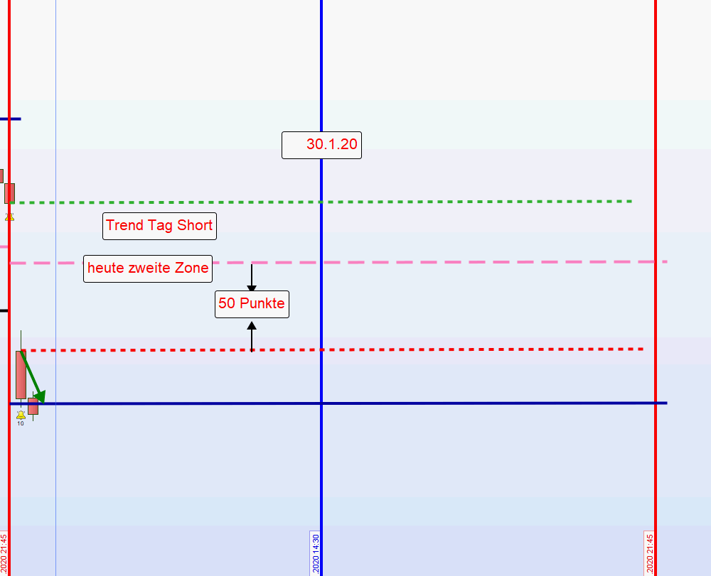 Über dem Eröffnungskurs befinden sich Short Zonen wie gewohnt. Wird die Gap geschlossen dient der Schlusskurs vom Freitag als erste Zone Long. Sollte dies eintreten, müssen wir unbedingt die DOW Futures in Betracht ziehen und wenn diese negativ notieren eventuell auf einen Einstieg Long verzichten. Es könnte sich ein weiterer Trend Tag Short anbahnen. -
