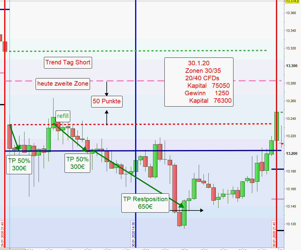 Nach Gewinn von 30 Punkten erfolgt eine Gewinnmitnahme (TP) von 50% der Kontrakte. Weitere 50%