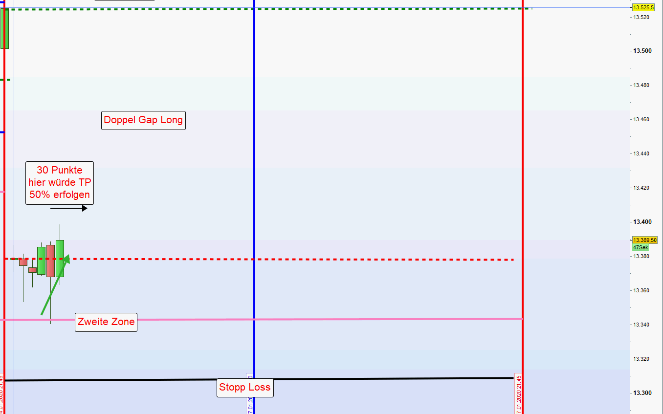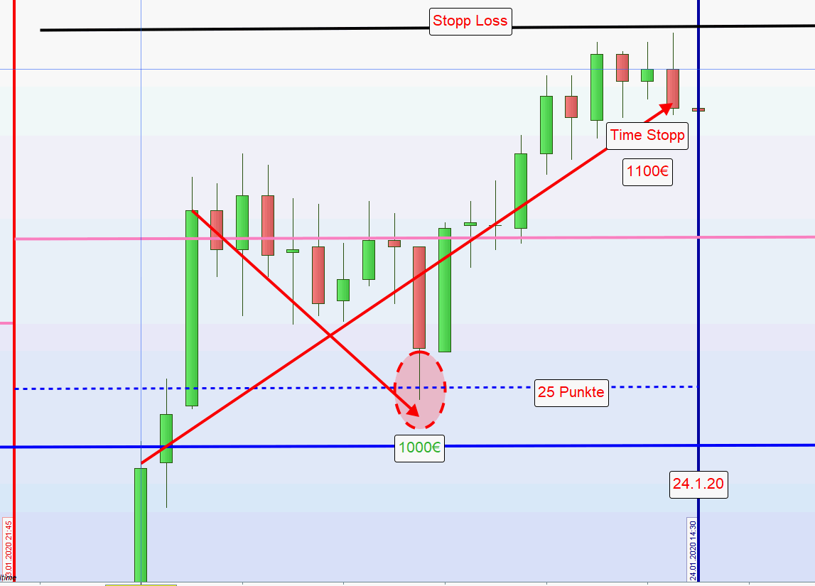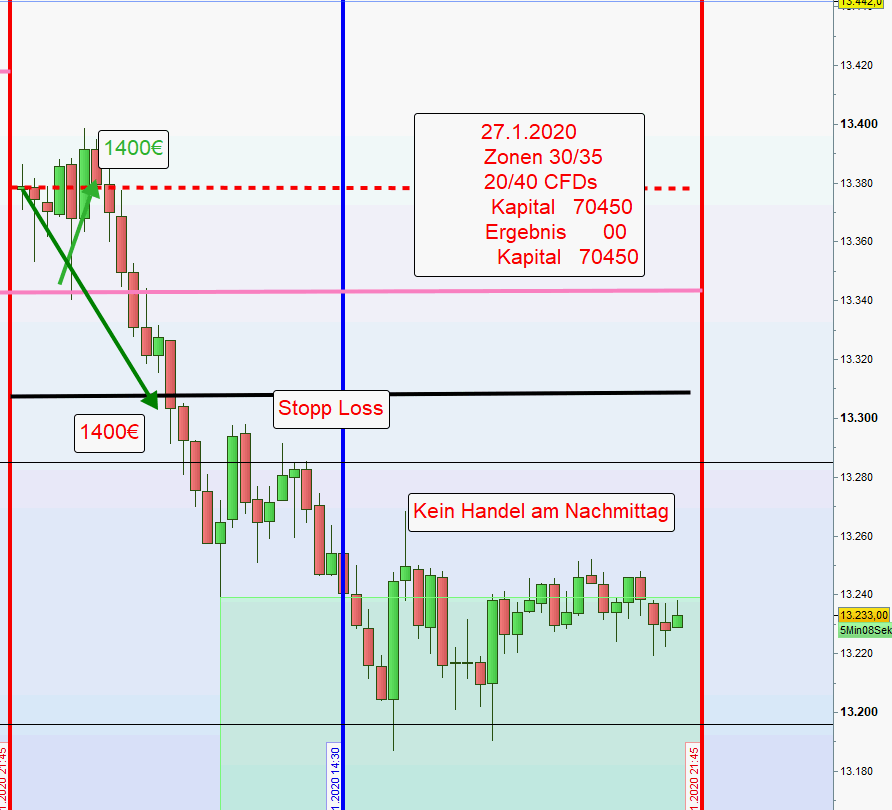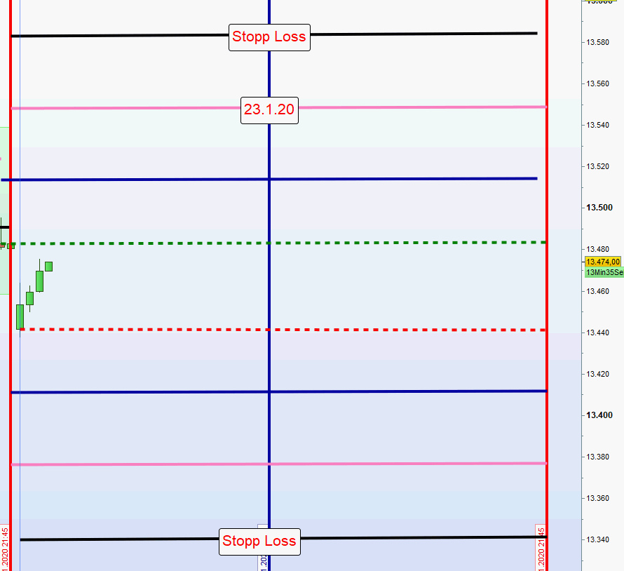 Sofern morgens beide Positionen aus der ersten und zweiten Zone mit hohem Verlust ausgestoppt wurden so wird auf dieser Seite des Charts nachmittags nur dann gehandelt, wenn nach Austoppung der Kurs vor neuer Positionseröffnung wieder in die zweite Zone gehandelt wurde. Der Grund für diese Sicherheitsmaßnahme ist, dass sehr oft nach Ausstoppung der Kurs die initiale Richtung fortsetzt und dann ein Trendtag vorliegt. -