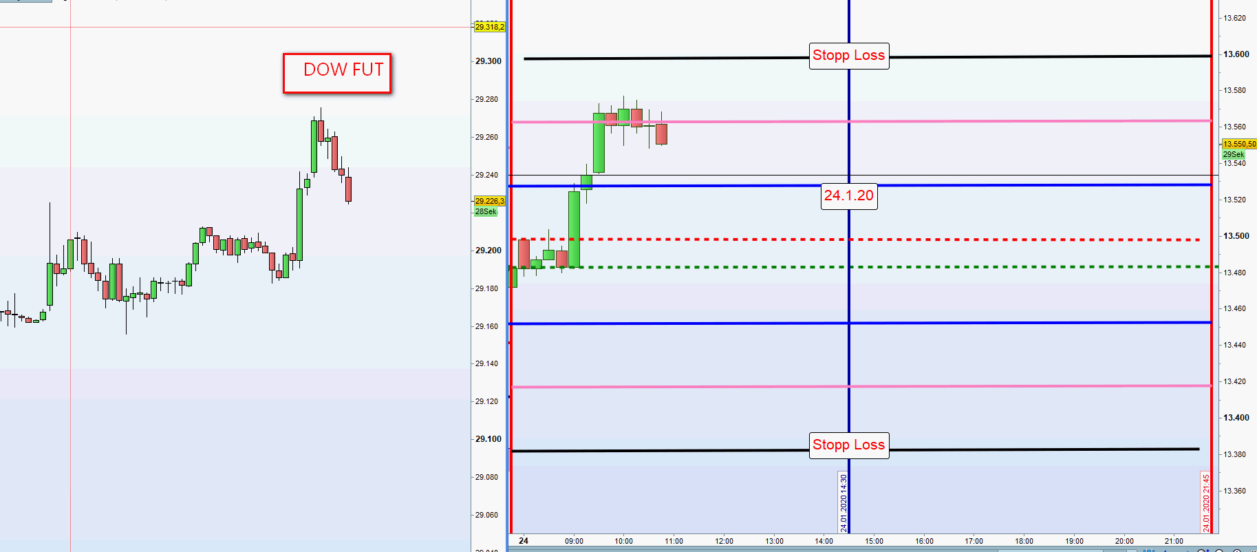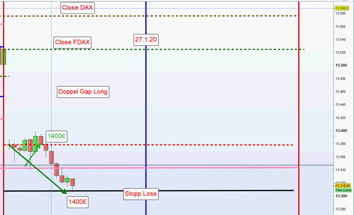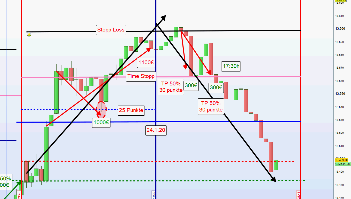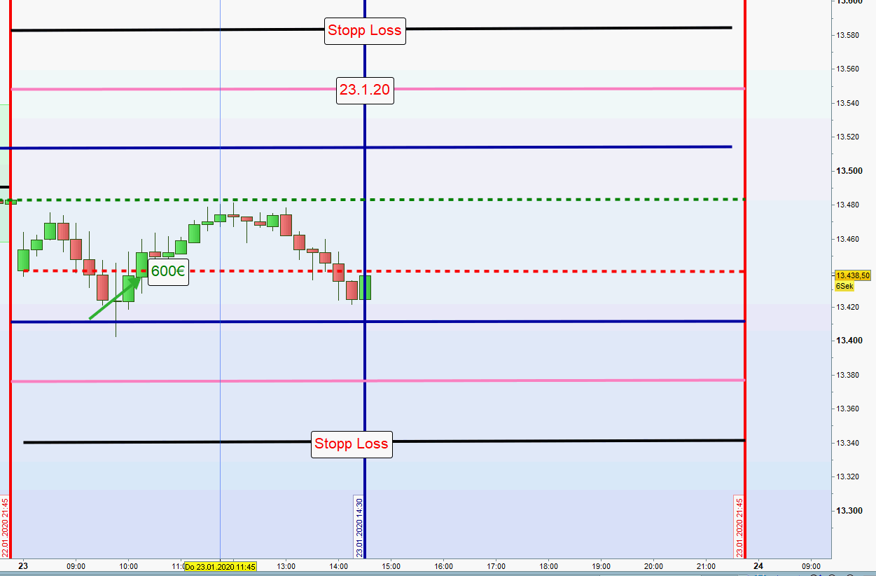 Sofern morgens beide Positionen aus der ersten und zweiten Zone mit hohem Verlust ausgestoppt wurden so wird auf dieser Seite des Charts nachmittags nur dann gehandelt, wenn nach Austoppung der Kurs vor neuer Positionseröffnung wieder in die zweite Zone gehandelt wurde. Der Grund für diese Sicherheitsmaßnahme ist, dass sehr oft nach Ausstoppung der Kurs die initiale Richtung fortsetzt und dann ein Trendtag vorliegt. -