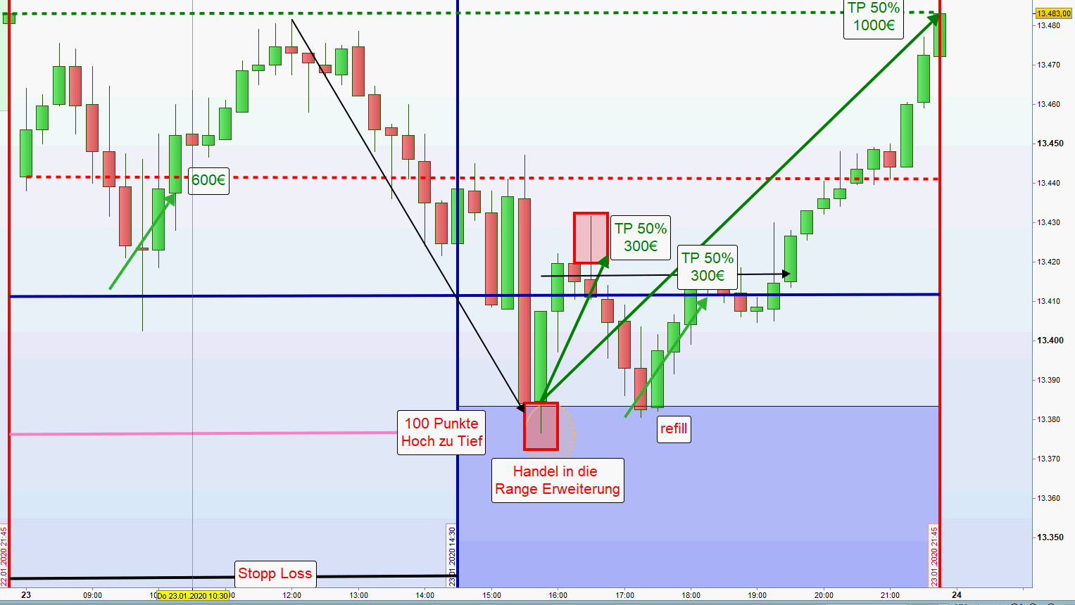 Das folgende ganzheitliche Regelwerk deckt alle Bewegungen innerhalb der täglichen Trading- Range/Handelsspanne ab. Zuweilen entscheidet der Common Sense oder bei Unsicherheit erfolgt kein Handel.
