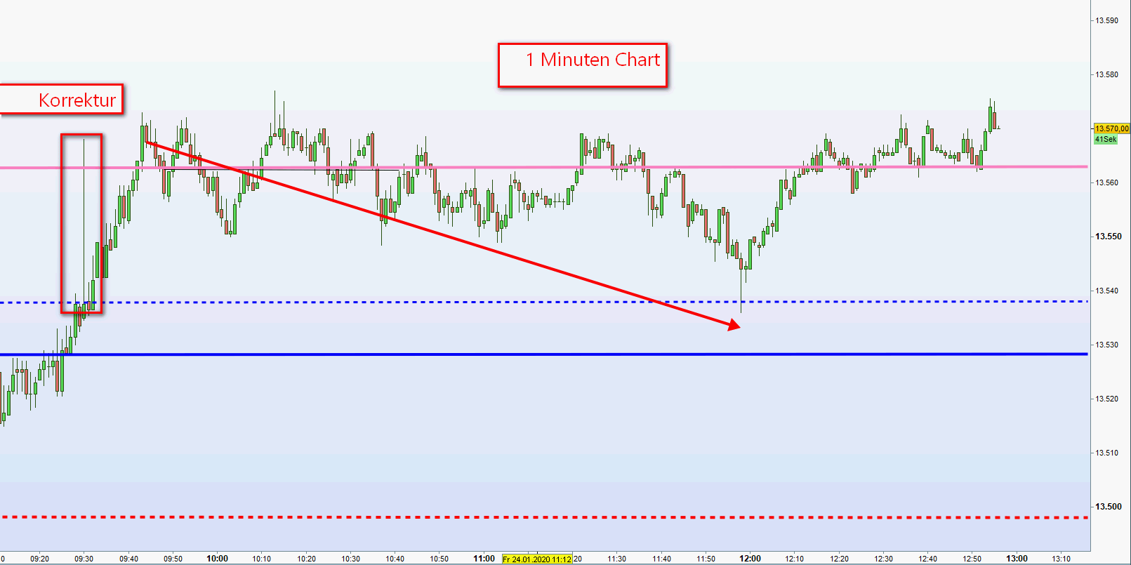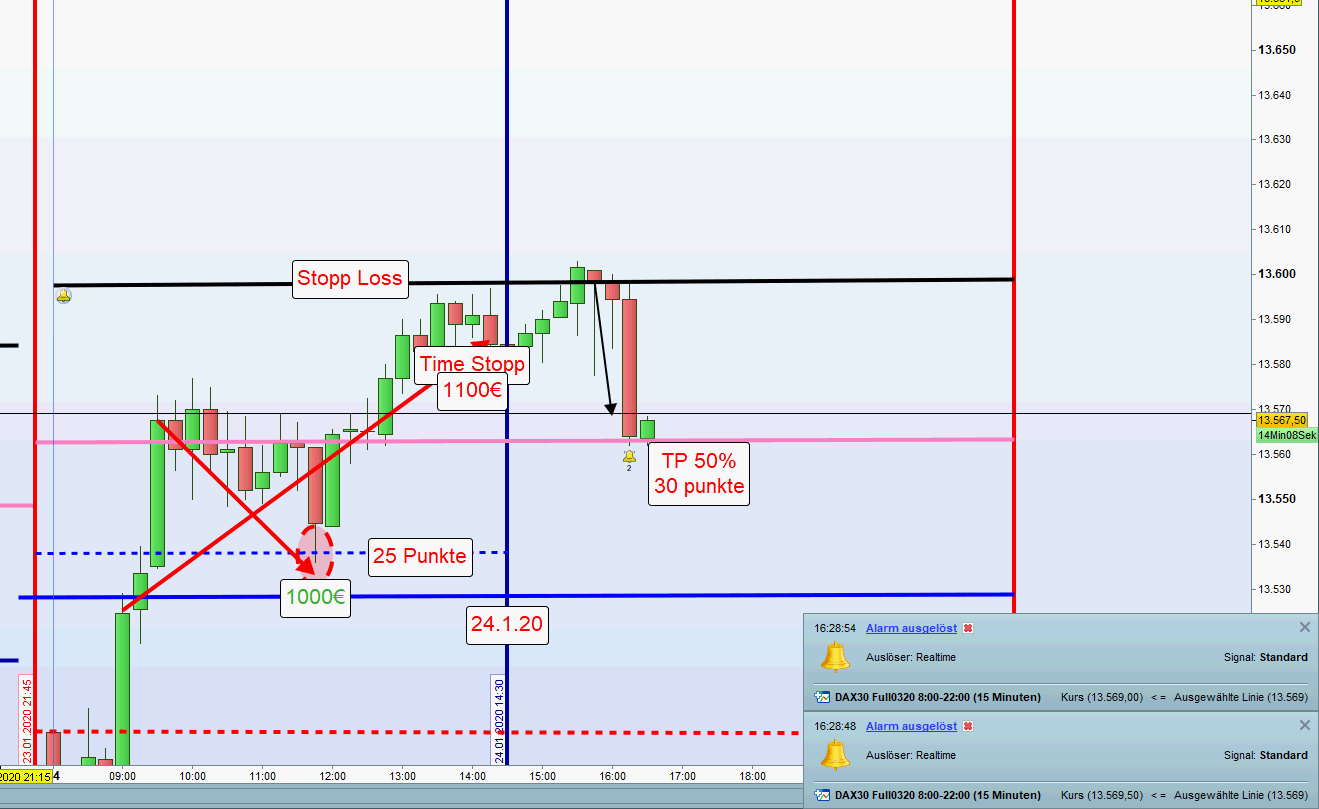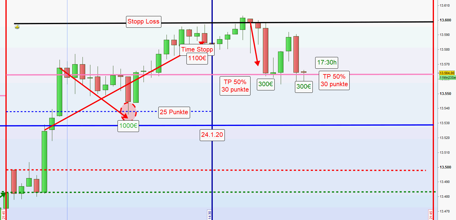 Im eingefügten 15M Chart kann man nicht erkennen, dass der Kurs nach Ersteintritt in die zweite Zone 29 Punkte korrigierte. Im weiteren 1M Chart jedoch sehr genau. Daraufhin wurde der TP auf 25 Punkte erfolgreich reduziert. -