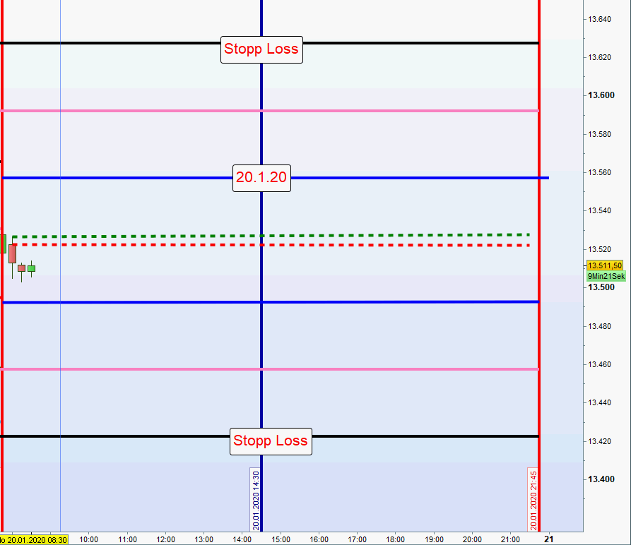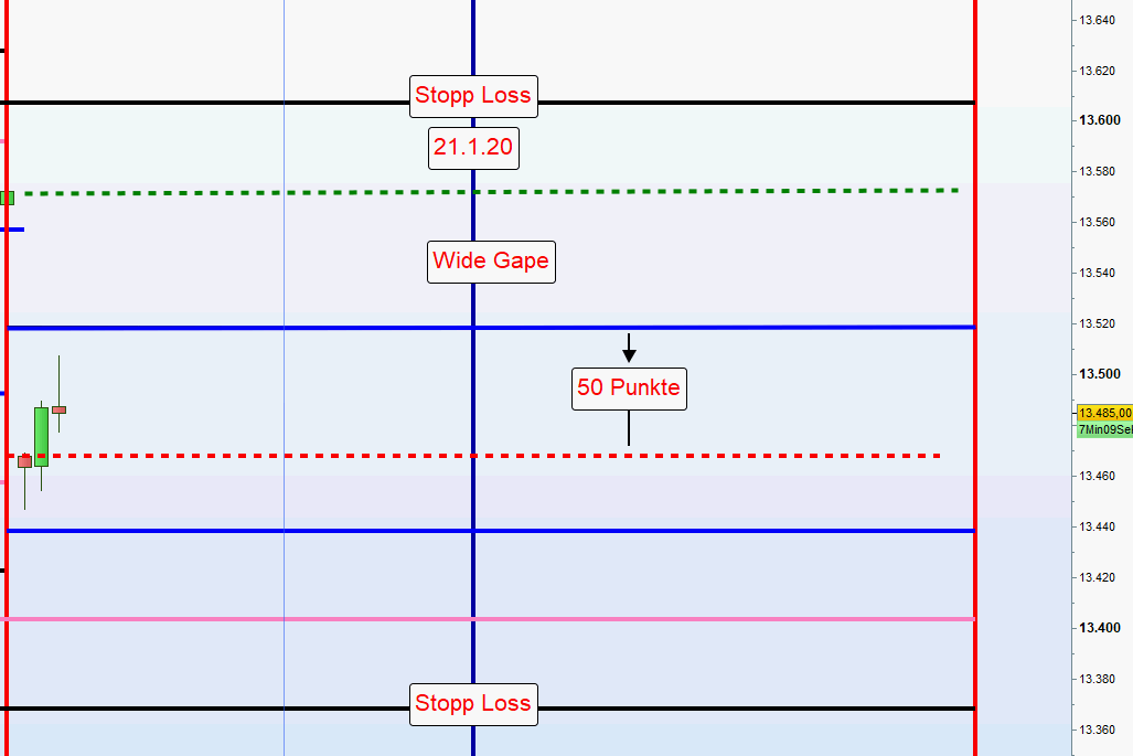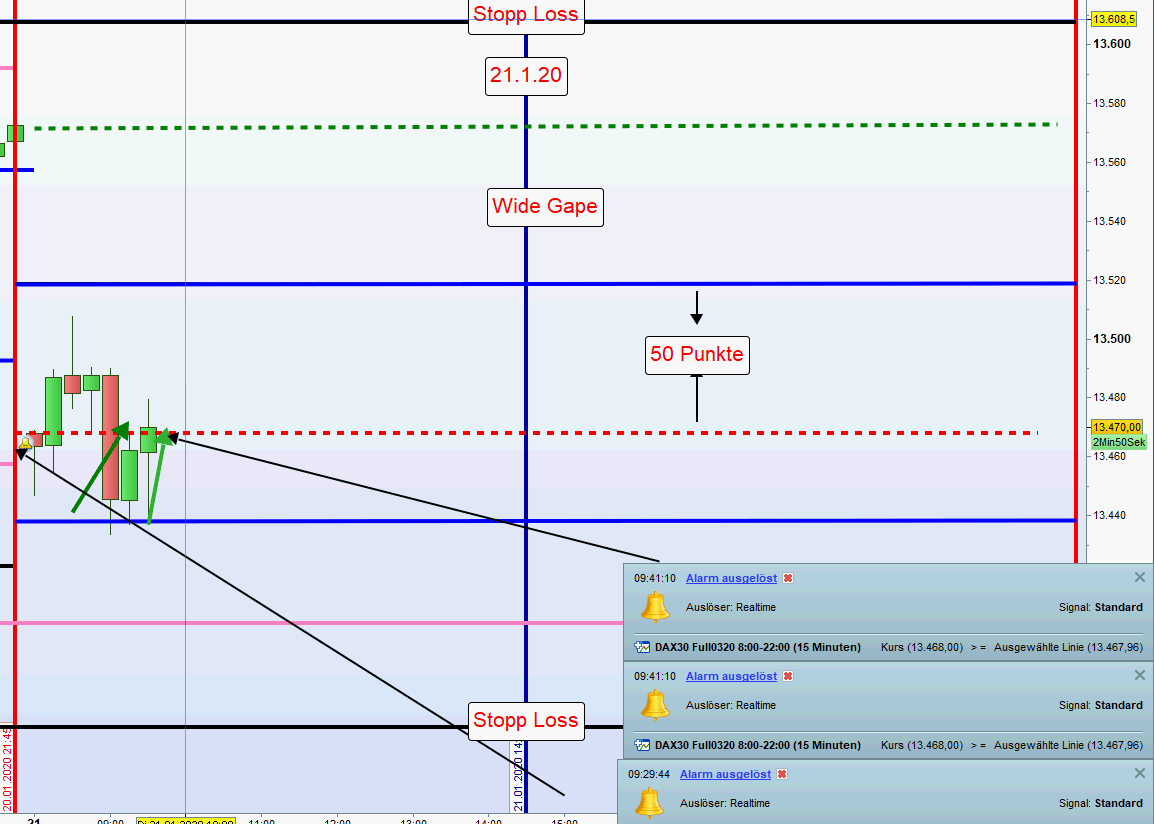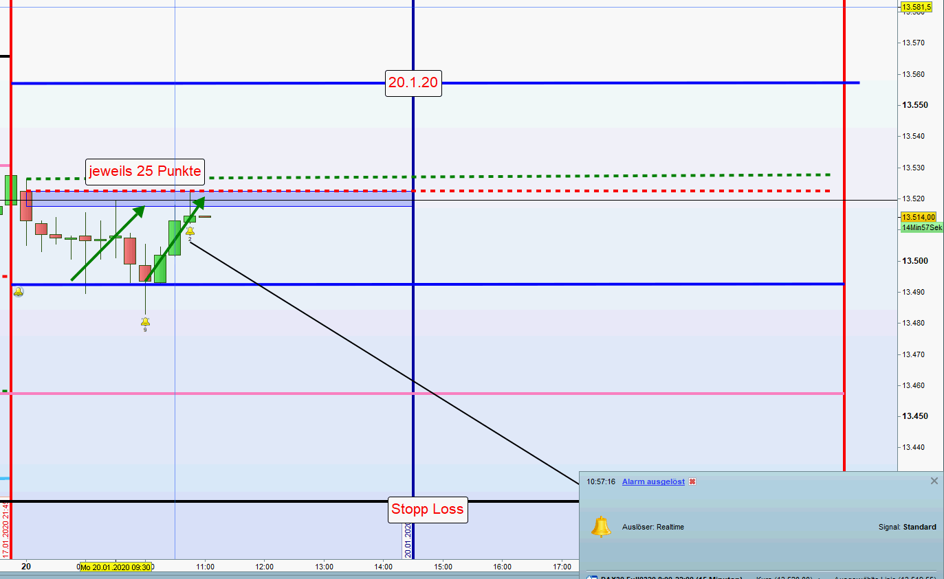 Ein systematischer Handelsansatz mit diskretionären Elementenverlangt Präsenz in der Nähe des Bildschirms. Beispielsweise sollte nach Erstellung des Handelsrahmens etwa 5 bis 10 Punkte vor den Zonen einen Alarm gesetzt werden. Manchmal durchschreiten die Kurse die Zonen mit Dynamik und zuweilen gibt es eine punktgenaue Berührung der Zonen mit sofortigem Reversal. Auch das knappe Verfehlen der Marken um ein oder zwei Punkte kommt vor. Ein geübter Trader kann beispielsweise eine Limit-Order in Wartestellung halten, um nach dem Alarm einen sofortigen Rücksetzer ohne vorherige Orderausführung einzufangen. Dies gilt auch für die Gewinnmitnahme.