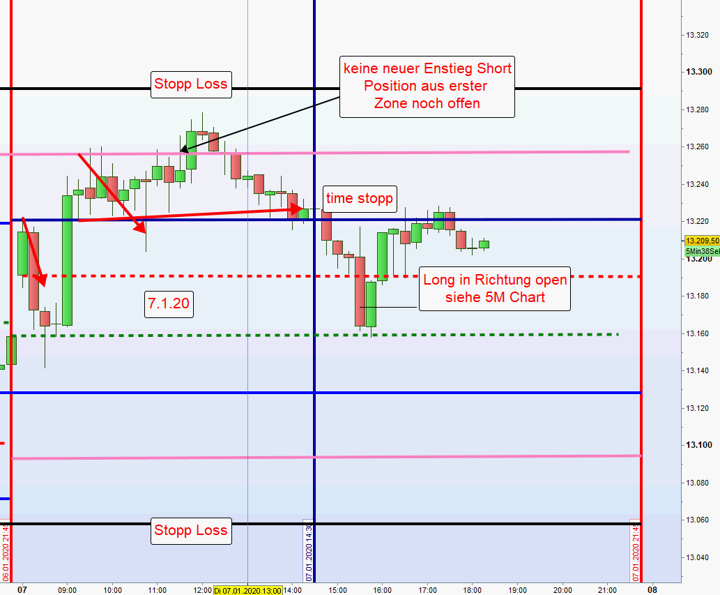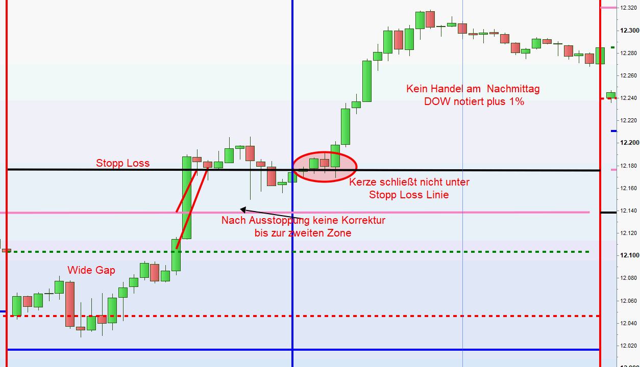 Einstieg short wenn der Kurs von oben die Linie kreuzt und Kerze, auch 5M ,unter der Linie schließt. Umgekehrt für long Positionen. Wurden morgens Positionen an der Linie ausgestoppt muss weiterhin der Kurs in Folge bis zur zweiten Zone korregieren. Auch darf zum Zeitpunkt einer Positionseröffung der DOW nicht -/+ 1% notieren