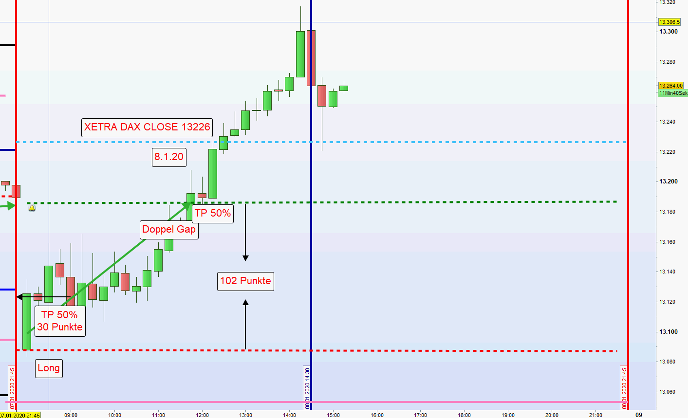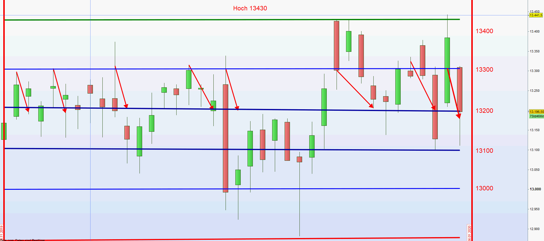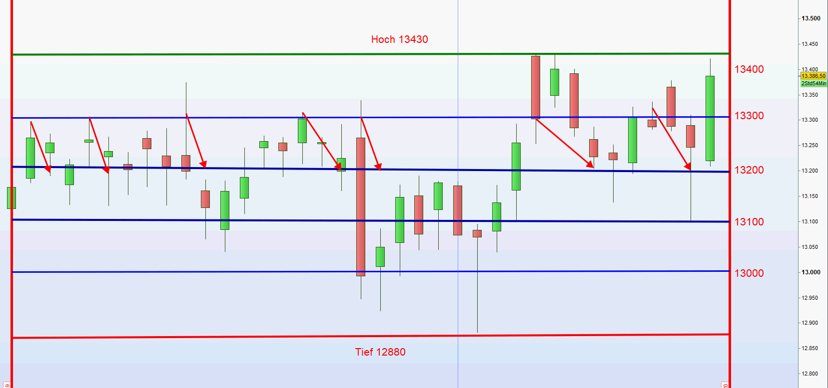 Angefügt Tageschart FDAX. Innerhalb der letzten 36 Handelstage war der Kurs 13300 ganz klar die Benchmark. Von dort aus konnte man sieben Mal Short mit einem satten Gewinn verkaufen.